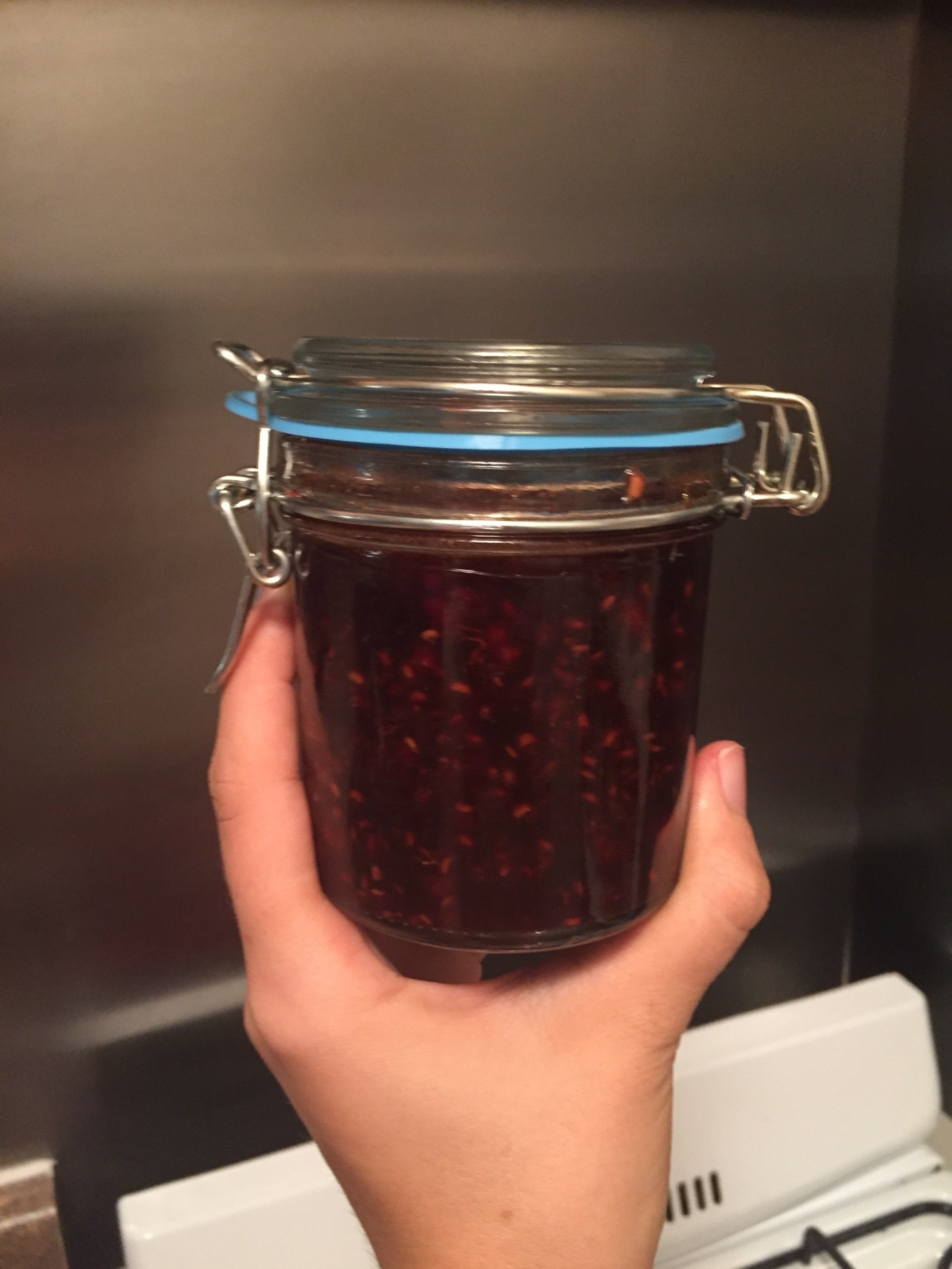 - Poor the berry mixture into a jar with a lid, Tupperware, or other sealable container.