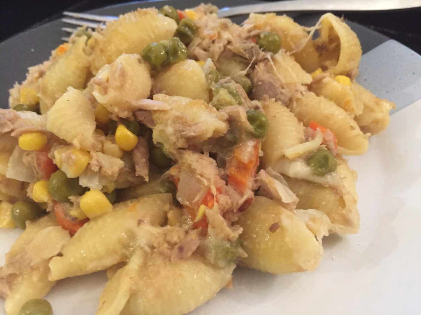 - Thoroughly mix the mayo into the tuna and onion mix and add the drained cans of sweet peas, sweet corn, and carrots.