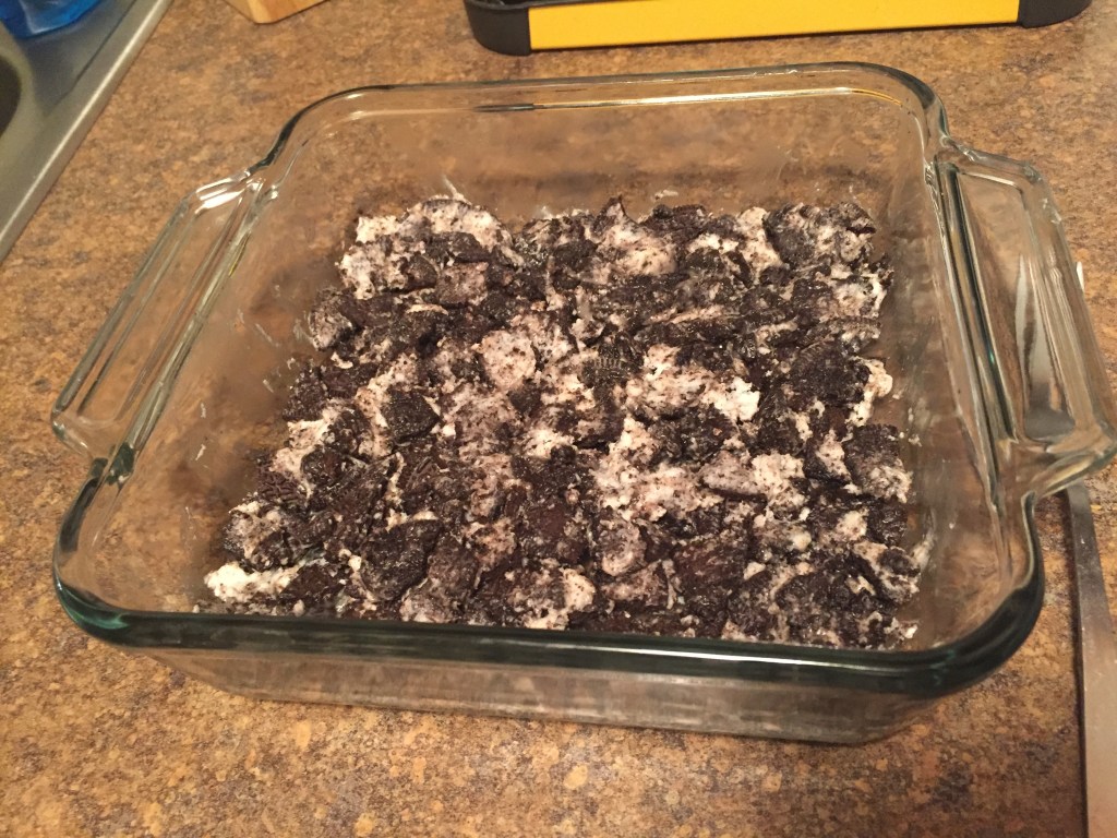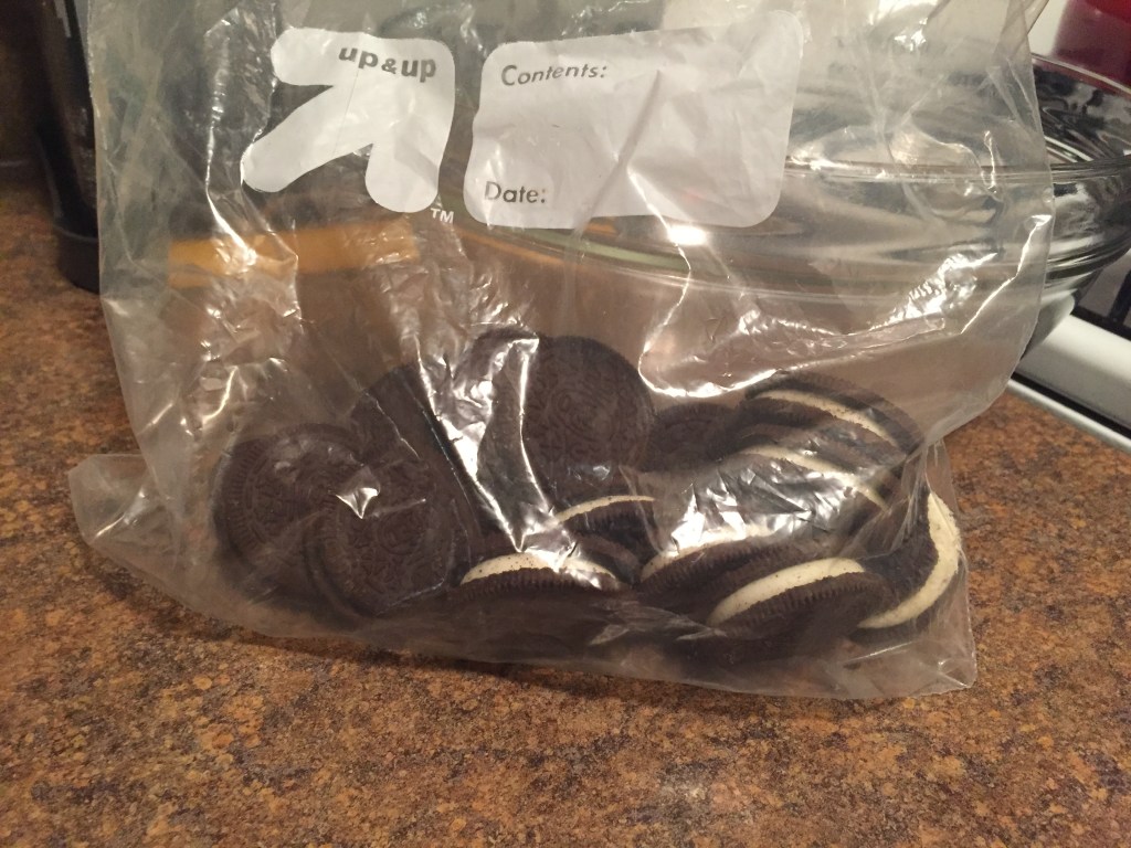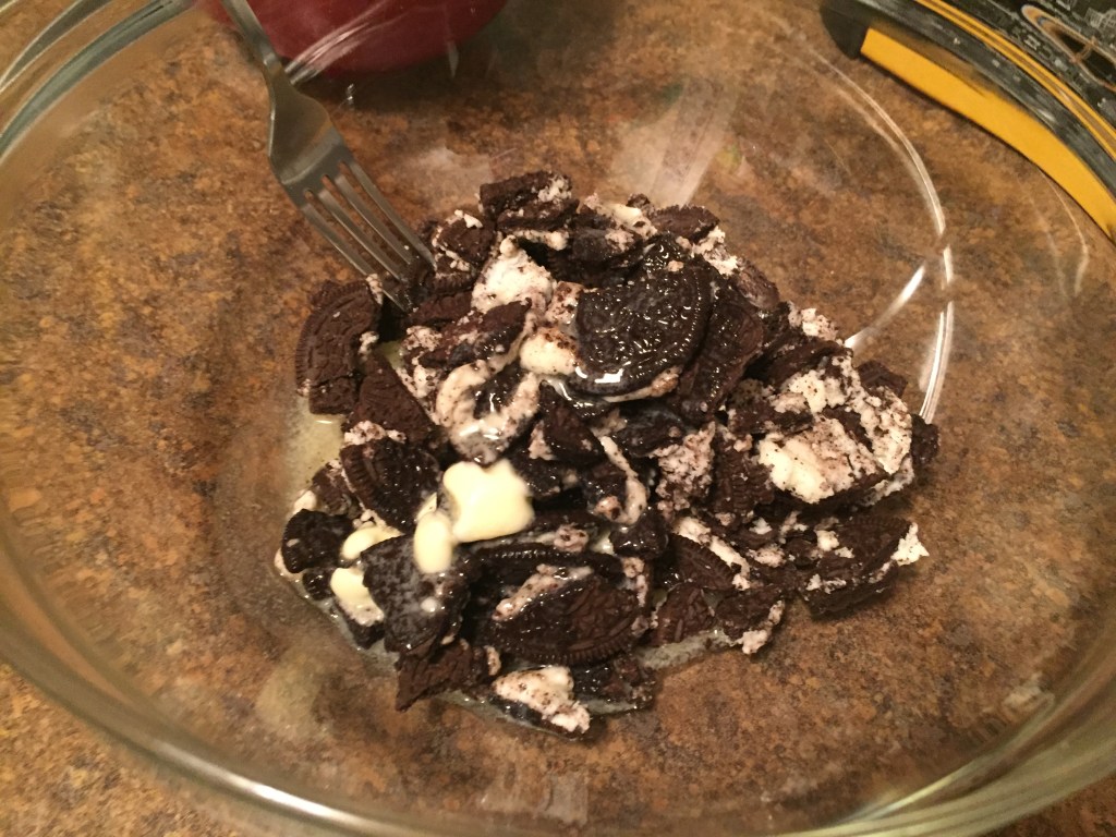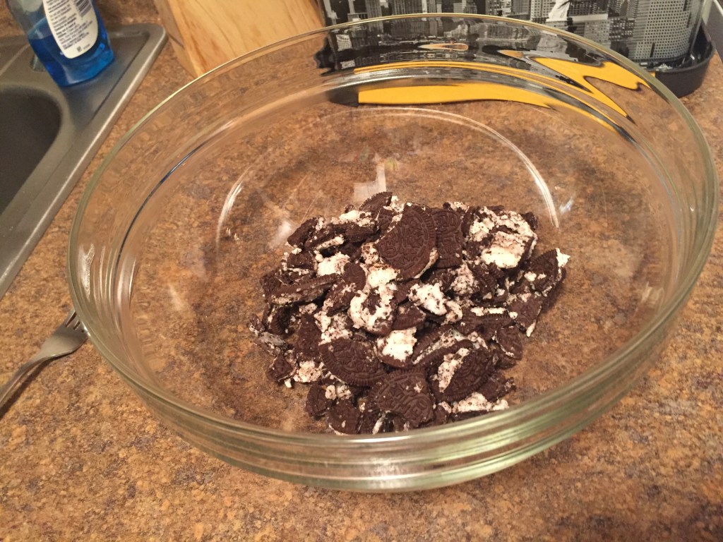 - Place 15 Oreos in a large Ziploc bag, break them up and place in a large mixing bowl.