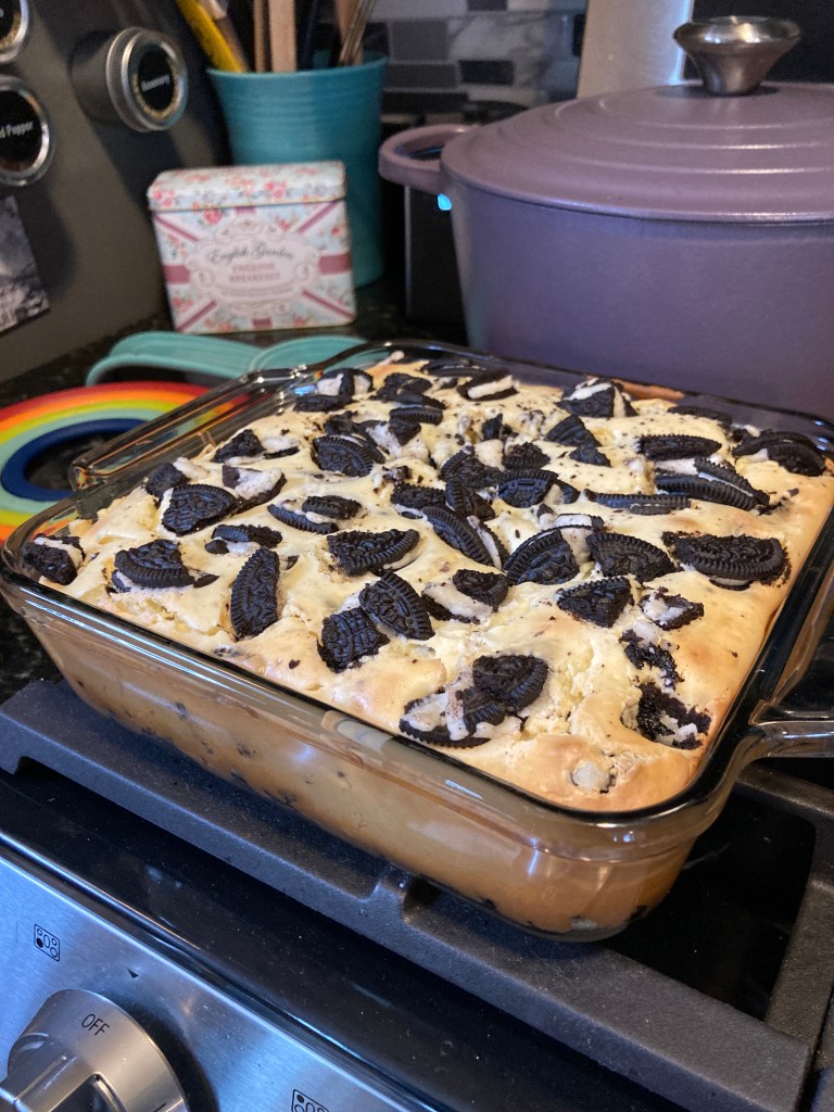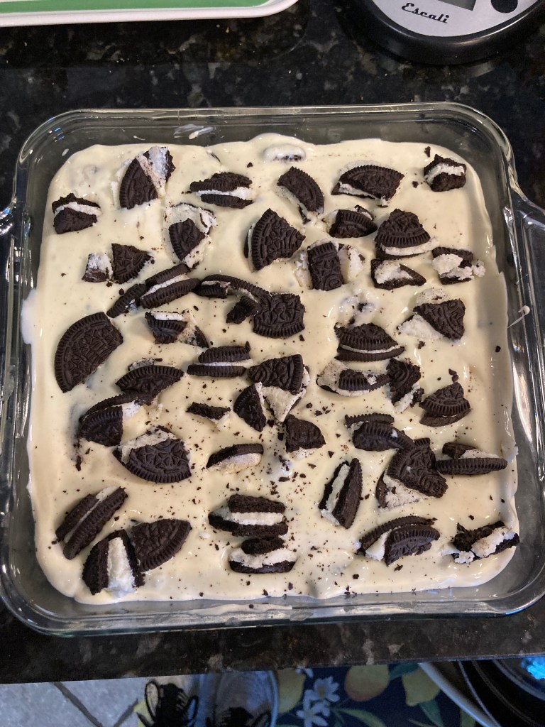 - Pour your mixture over the Oreo crust. Break up your last 7 Oreos and sprinkle the pieces on top. Place in the oven and bake for 60 minutes, or until center has set.