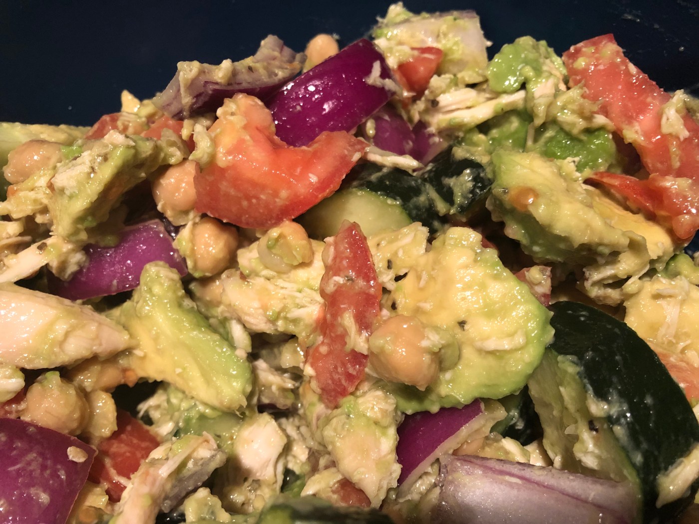 - Chop avocados, cucumber, Roma tomatoes, and red onion. Mix in a large salad bowl. Add the drained chickpeas and the shredded chicken and mix thoroughly.
