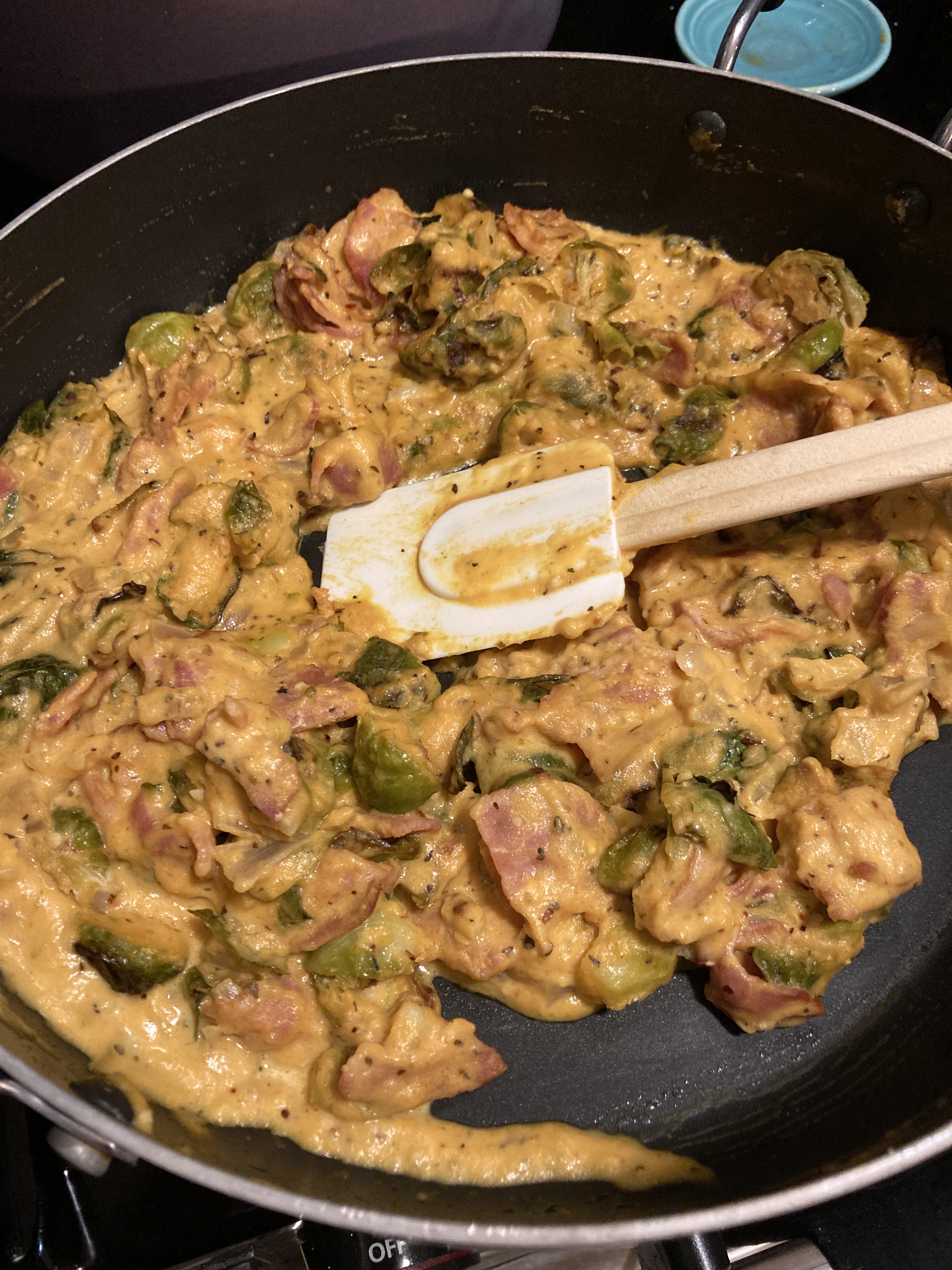 - Cut bacon into 1 inch pieces and cook in a separate pan. Set aside when done.