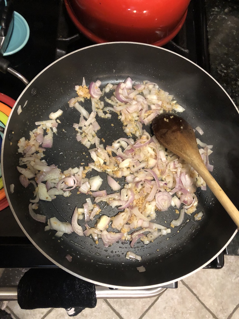 - Chop shallots. In a large skillet, heat olive oil and add garlic and shallots. Cook over medium-high heat until fragrant.