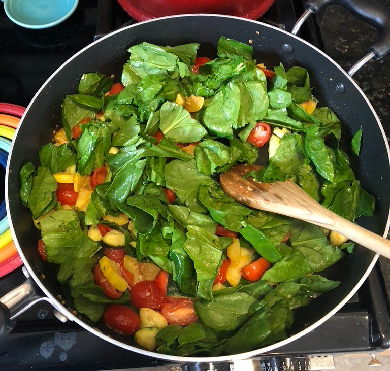 - Add the tomatoes and cook until blistering, about 3 minutes.