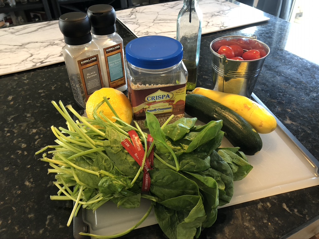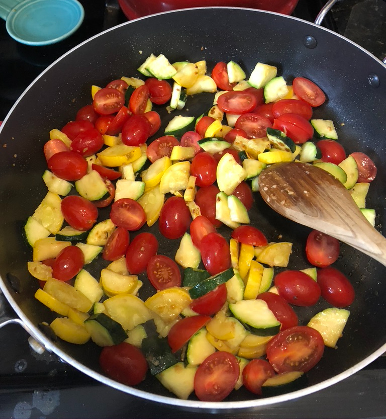 - Meanwhile in a large skillet heat the olive and garlic over medium high heat until fragrant. Add the zucchini and squash and cook until tender, about five minutes.