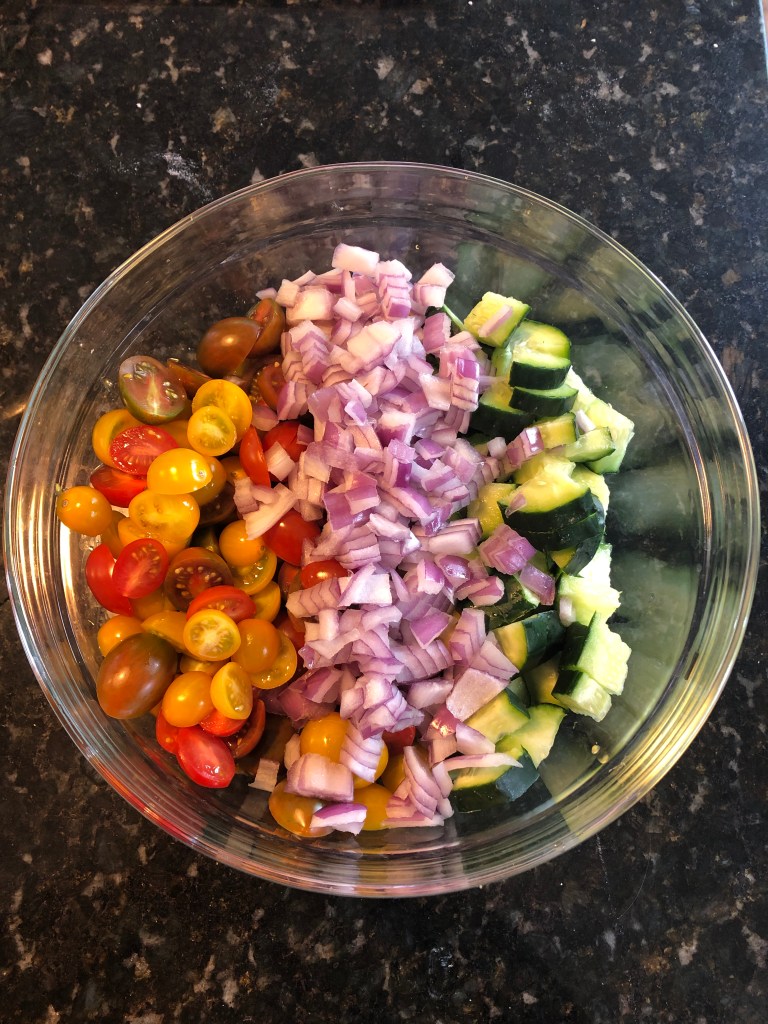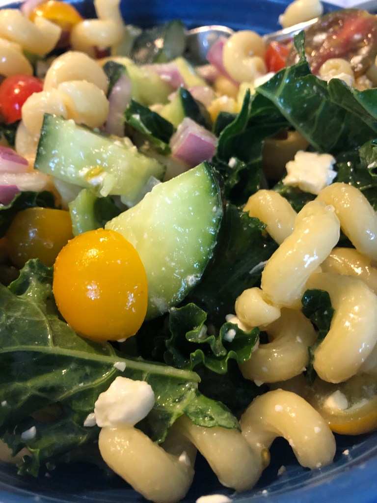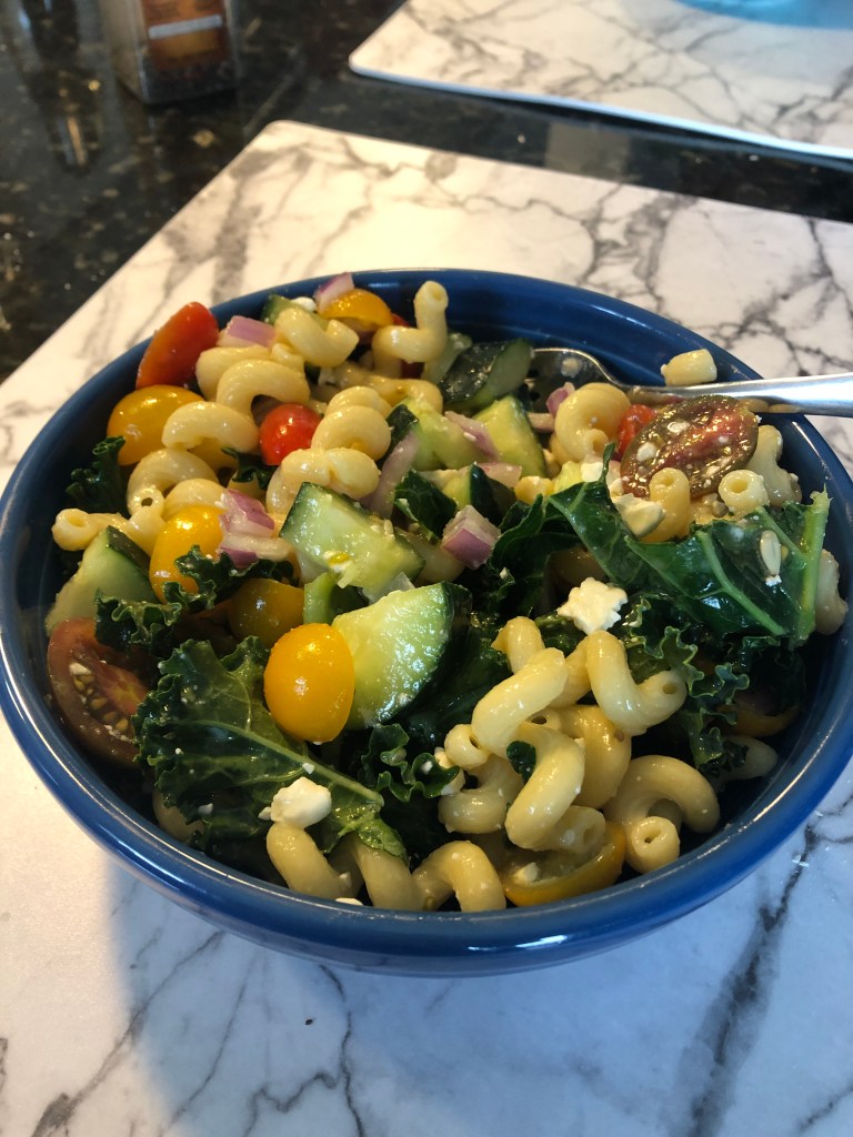 - Slice and quarter the cucumber, half the tomatoes, and dice the red onion. Place in a large mixing bowl. Add in the pasta and kale and mix in the prepared dressing. Mix in the feta.
