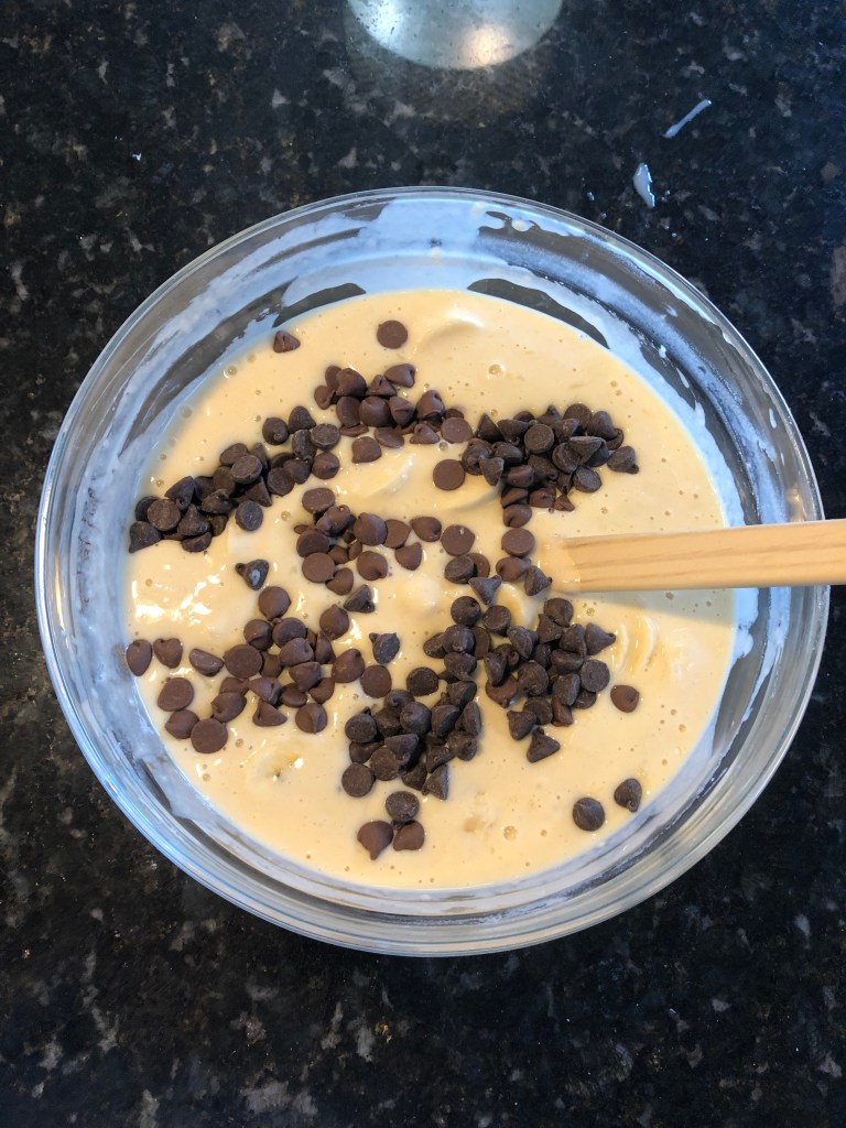 - Slice the bananas and add them to the batter and mix. Add the chocolate chips and gently mix.