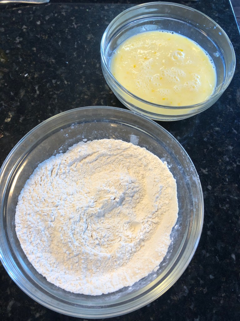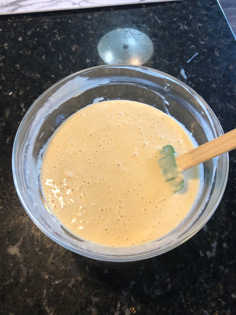 - In a large bowl mix together the flour, baking powder, baking soda, and salt. In another bowl mix together the milk, melted butter, honey, and two eggs. Gently mix the wet ingredients into the dry ingredients until evenly combined.
