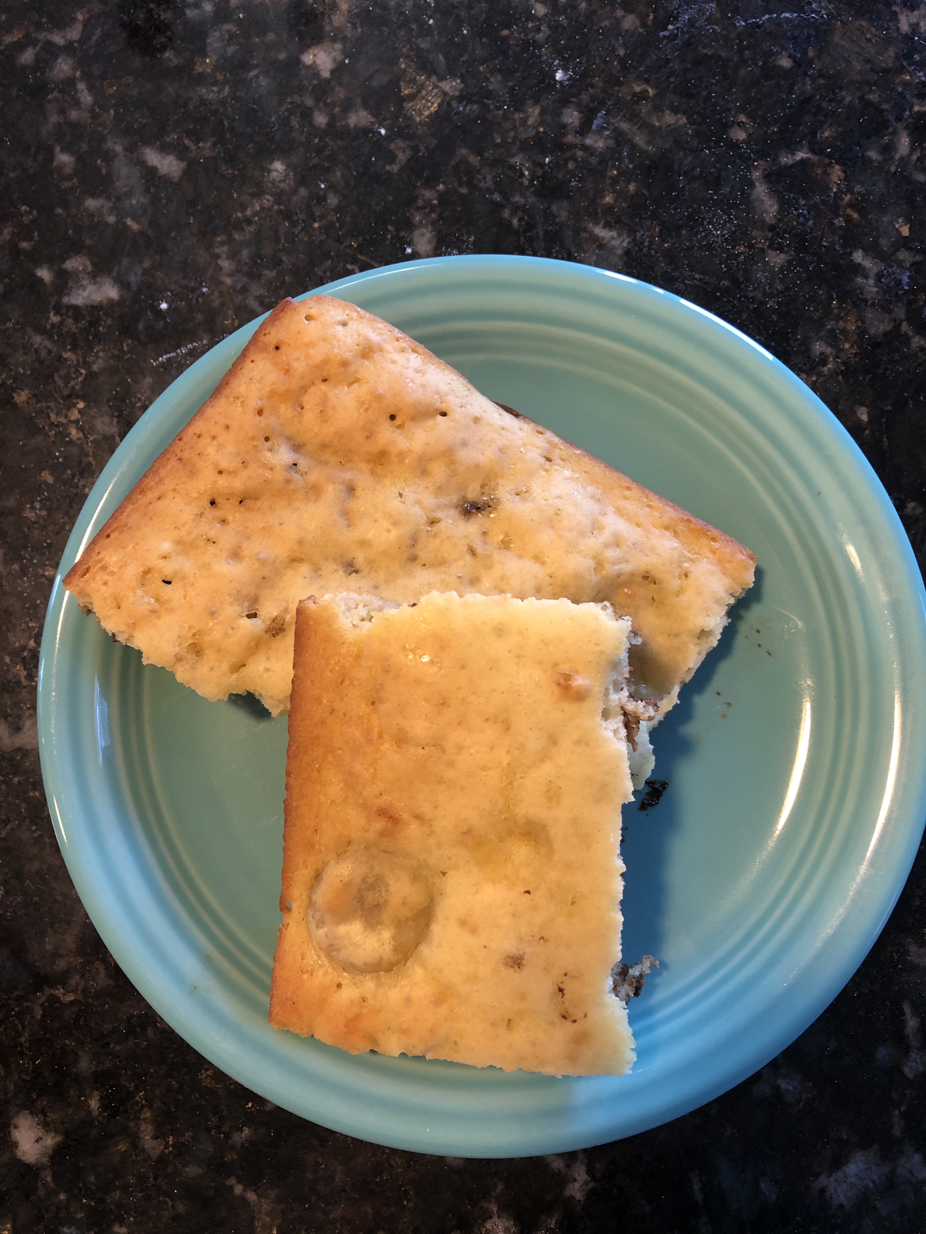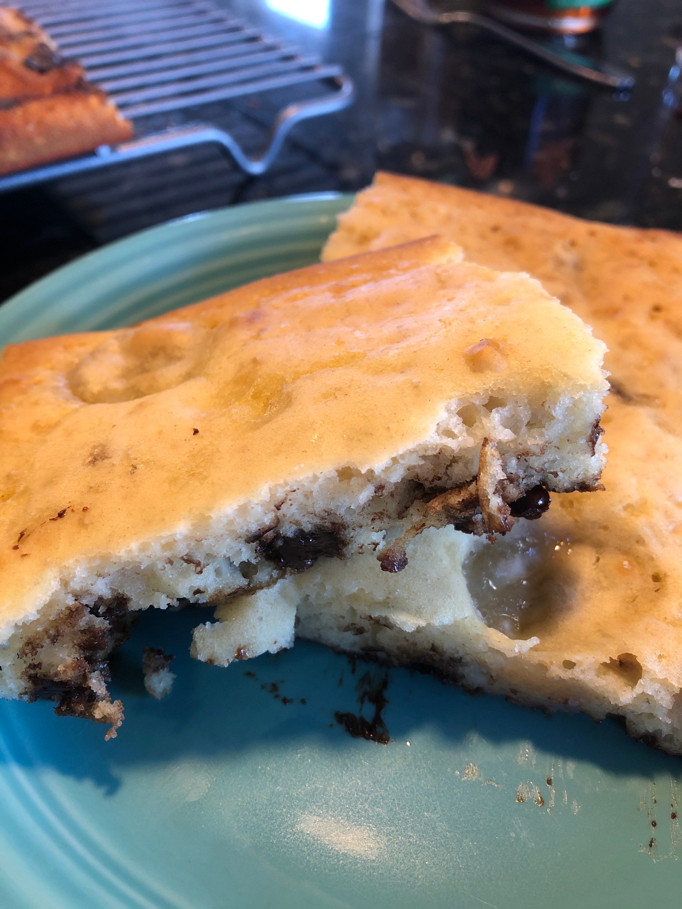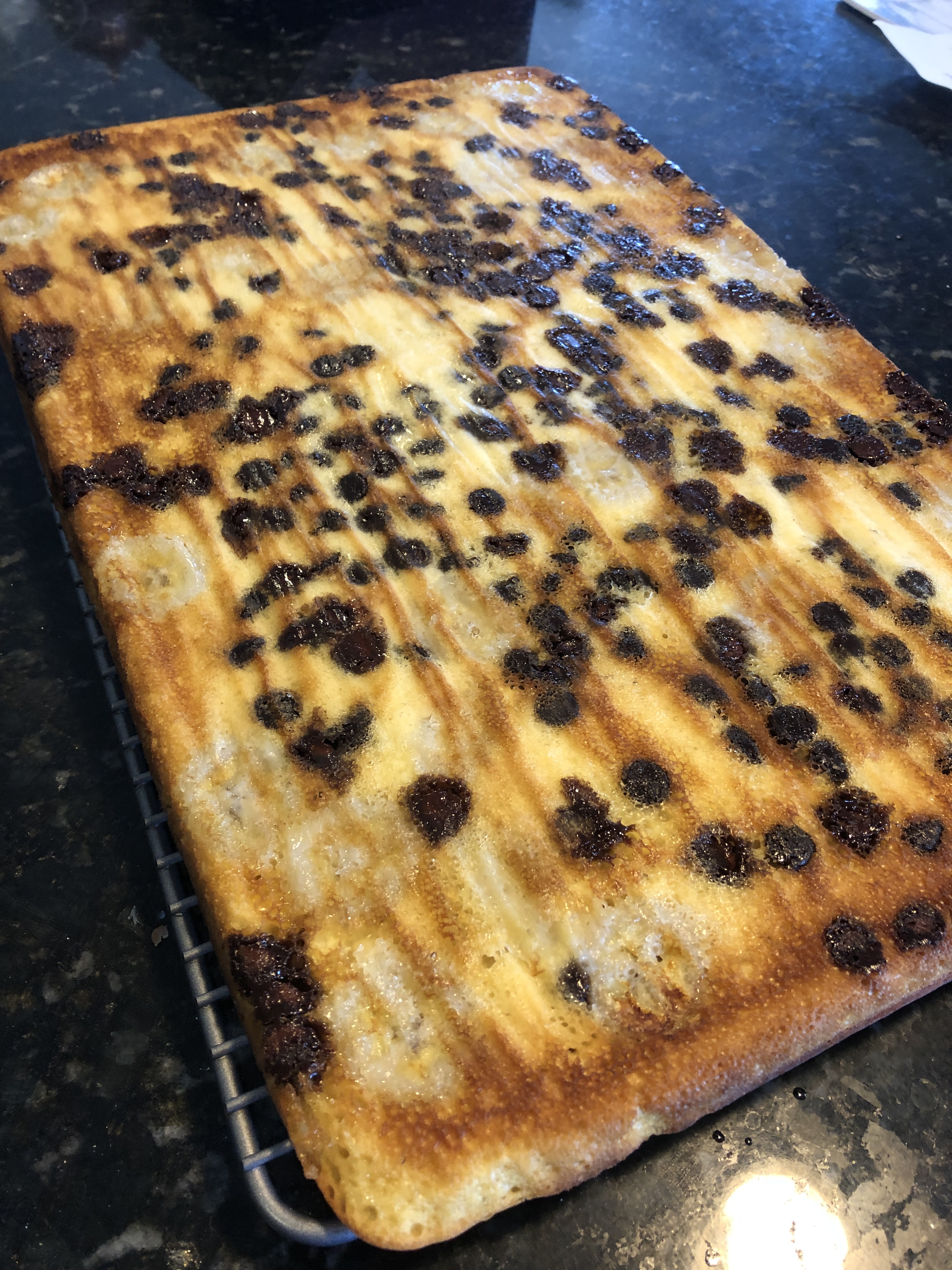 - Bake for 12-15 minutes until done. Let cool for a couple minutes then flip out the pancake. (I prefer flipping it out onto a cooling rack.) Slice into 16 pieces and enjoy!