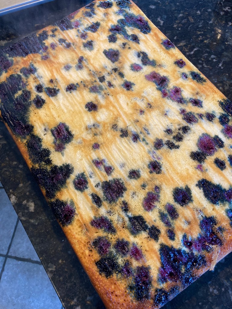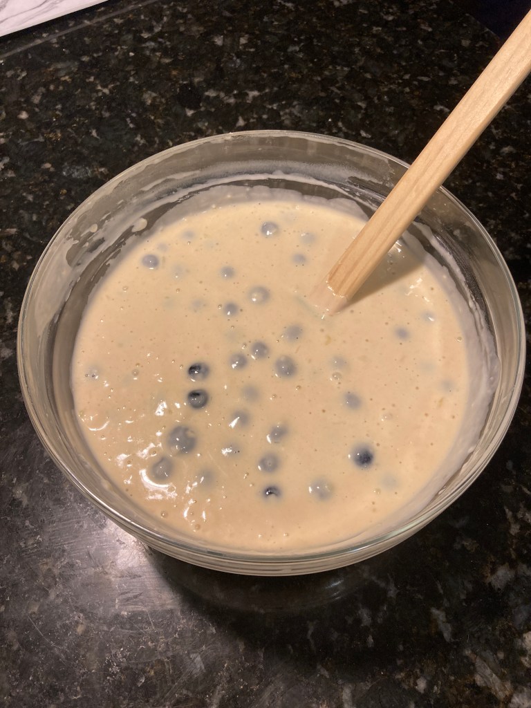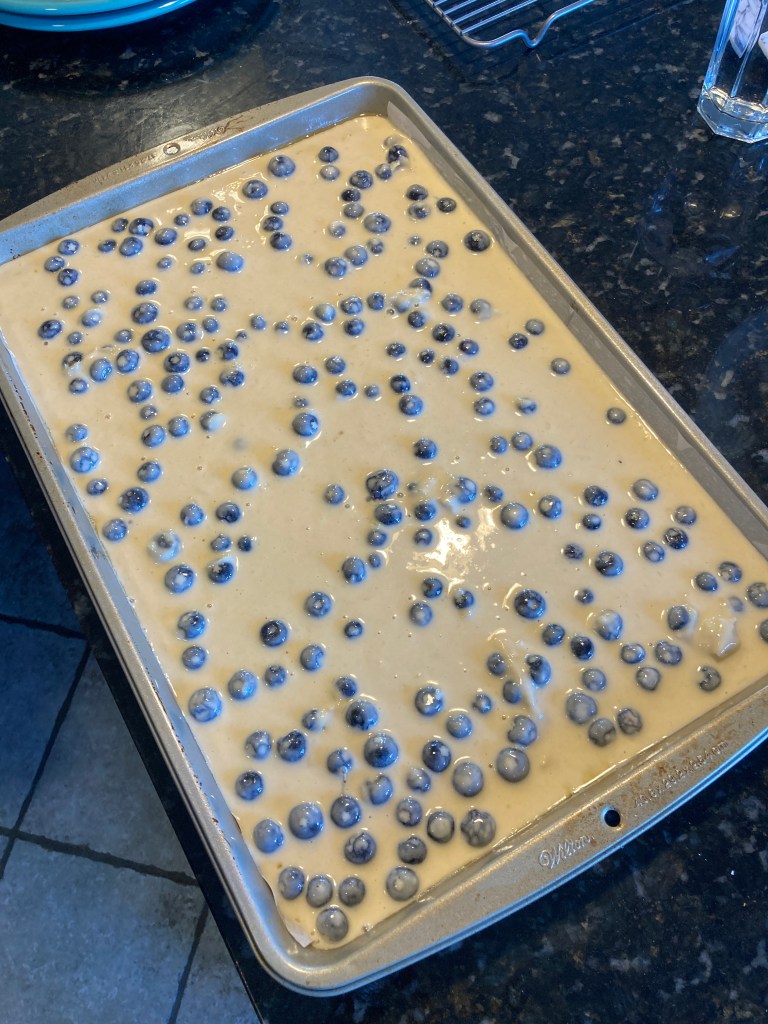 - Mix in blueberries. Spray a large baking sheet with non-stick spray. Layer with parchment paper and spray again (!) with more non-stick spray. Pour the mixture and tap the sheet against your counter a few times to level out the batter.