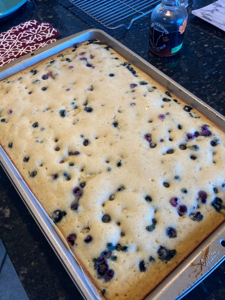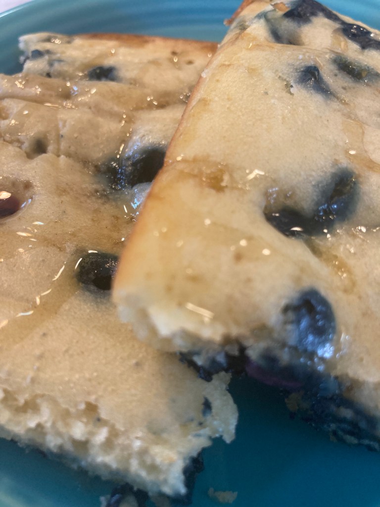 After the success of Banana Chocolate Sheet Pancakes I made a blueberry version! These turned out great and were perfect for a crowd at my Fourth of July brunch (added strawberries and mascarpone as topping for a red, white, and blue effect!). Try them out this summer and enjoy!