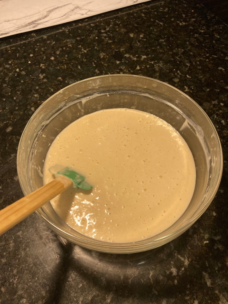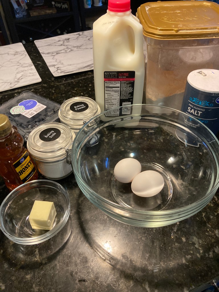 - In a large bowl mix together the flour, baking powder, baking soda, and salt. In another bowl mix together the milk, melted butter, honey, and two eggs. Gently mix the wet ingredients into the dry ingredients until evenly combined.
