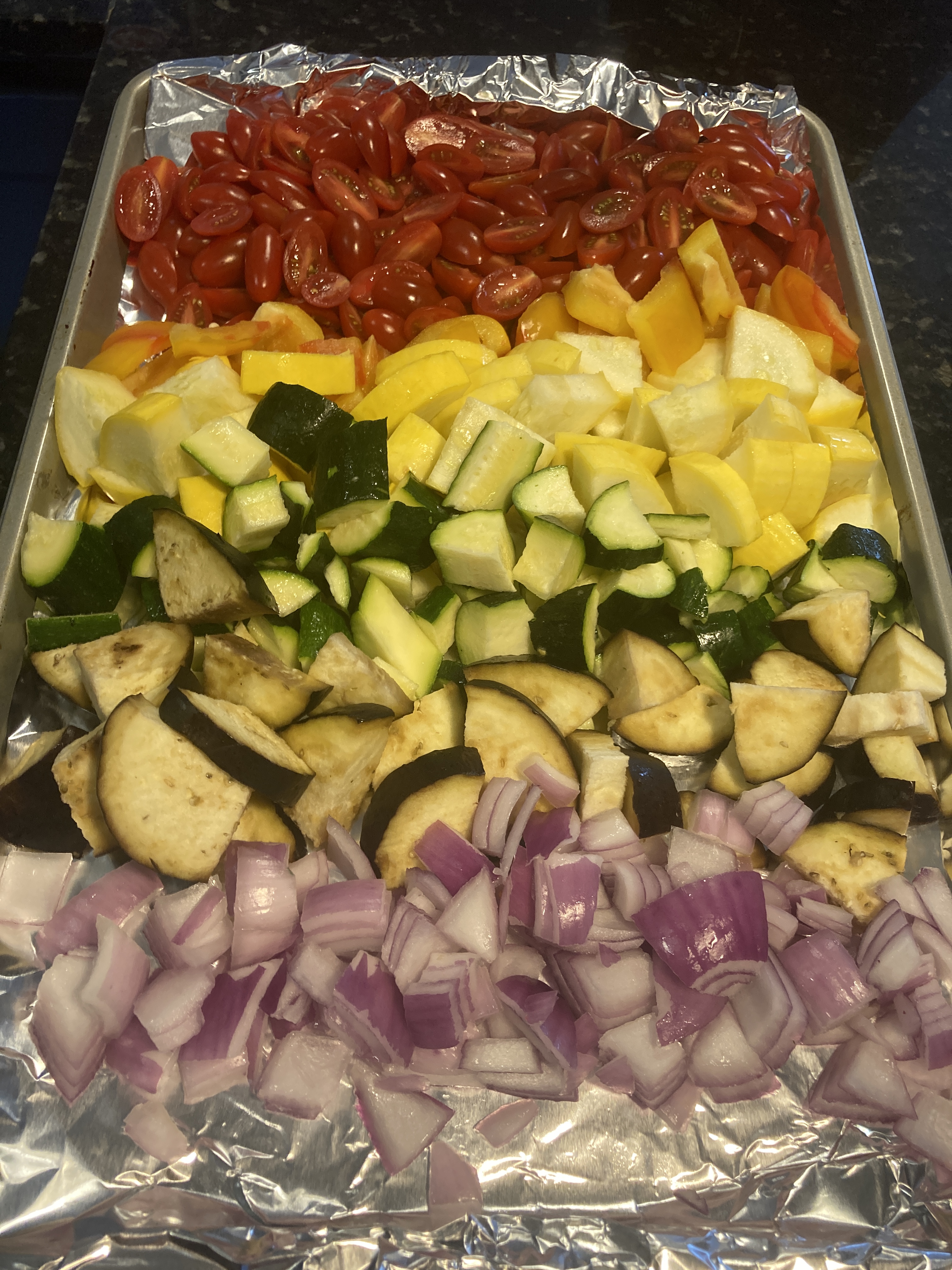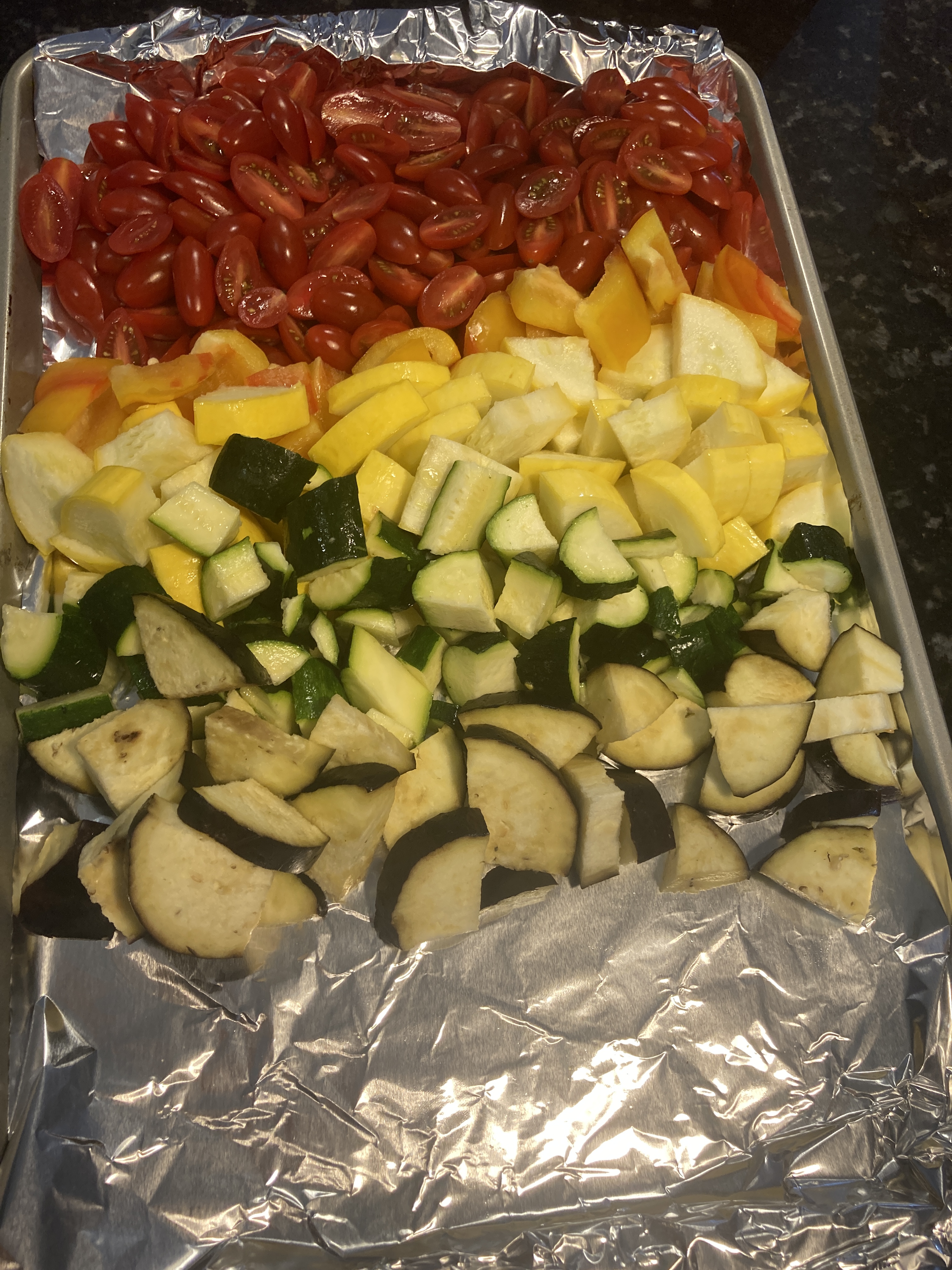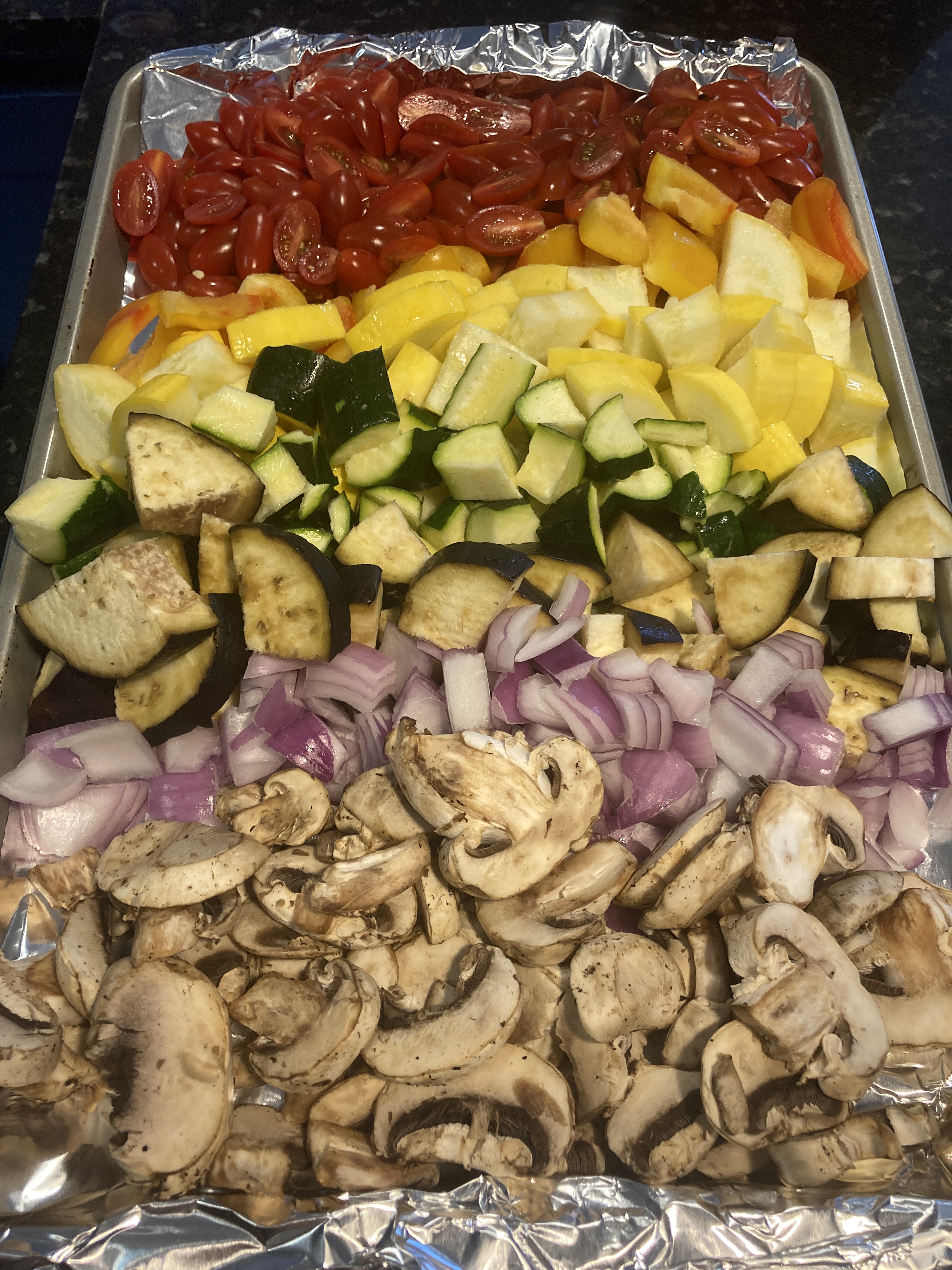 - Lay out the vegetables on the baking sheet: tomatoes, bell pepper, squash, zucchini, eggplant, onion, and mushrooms.