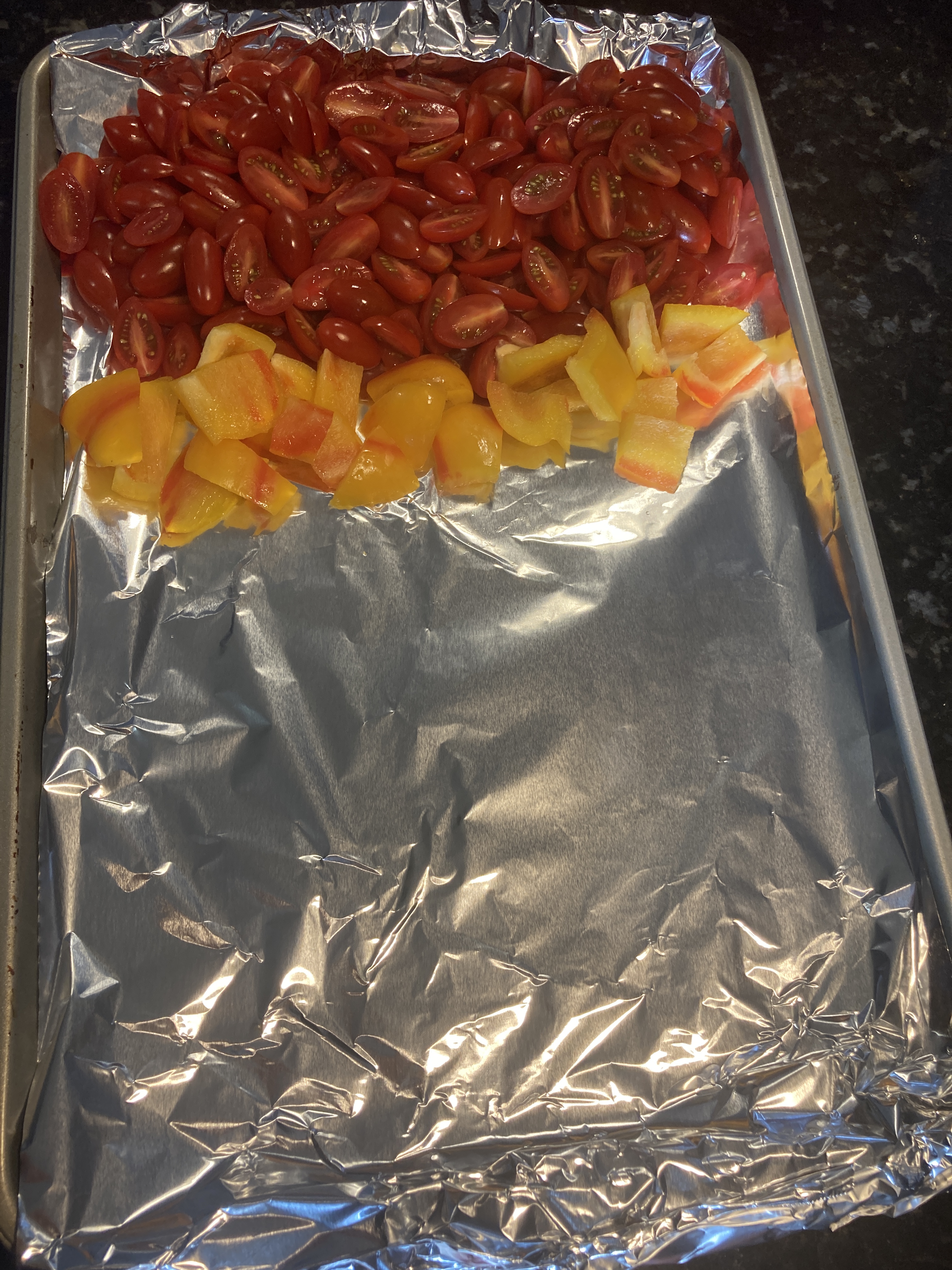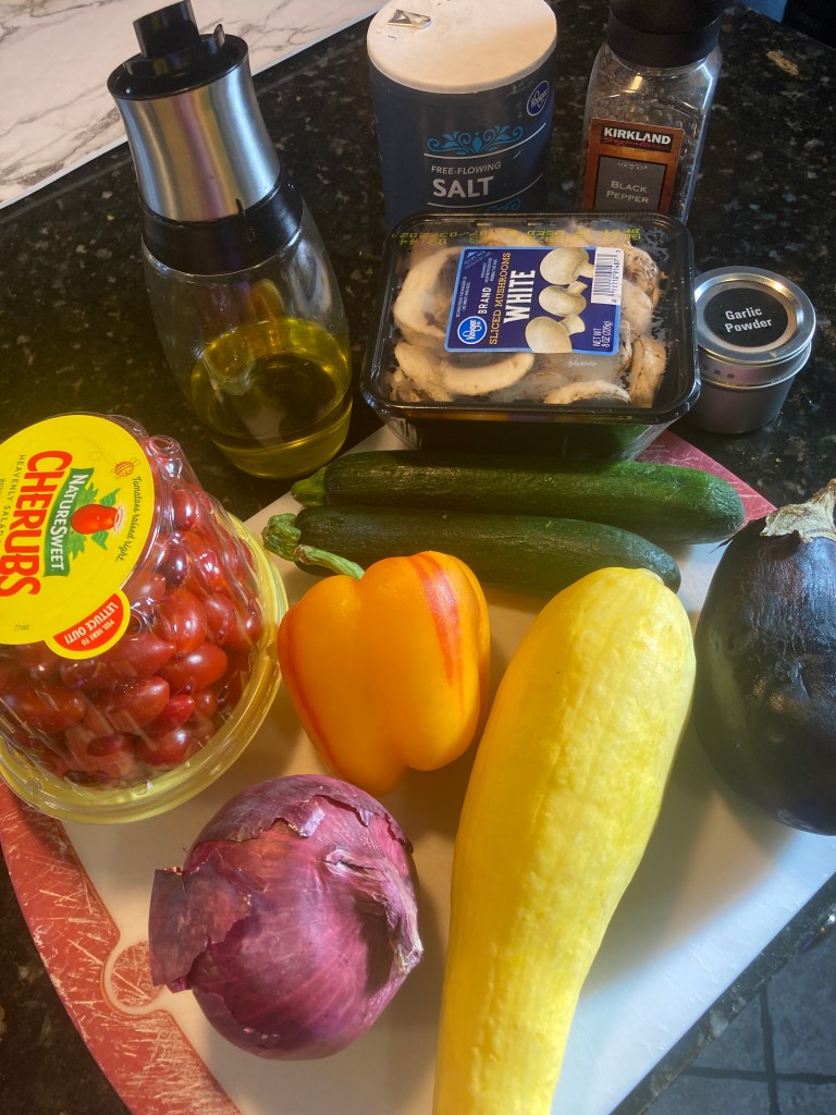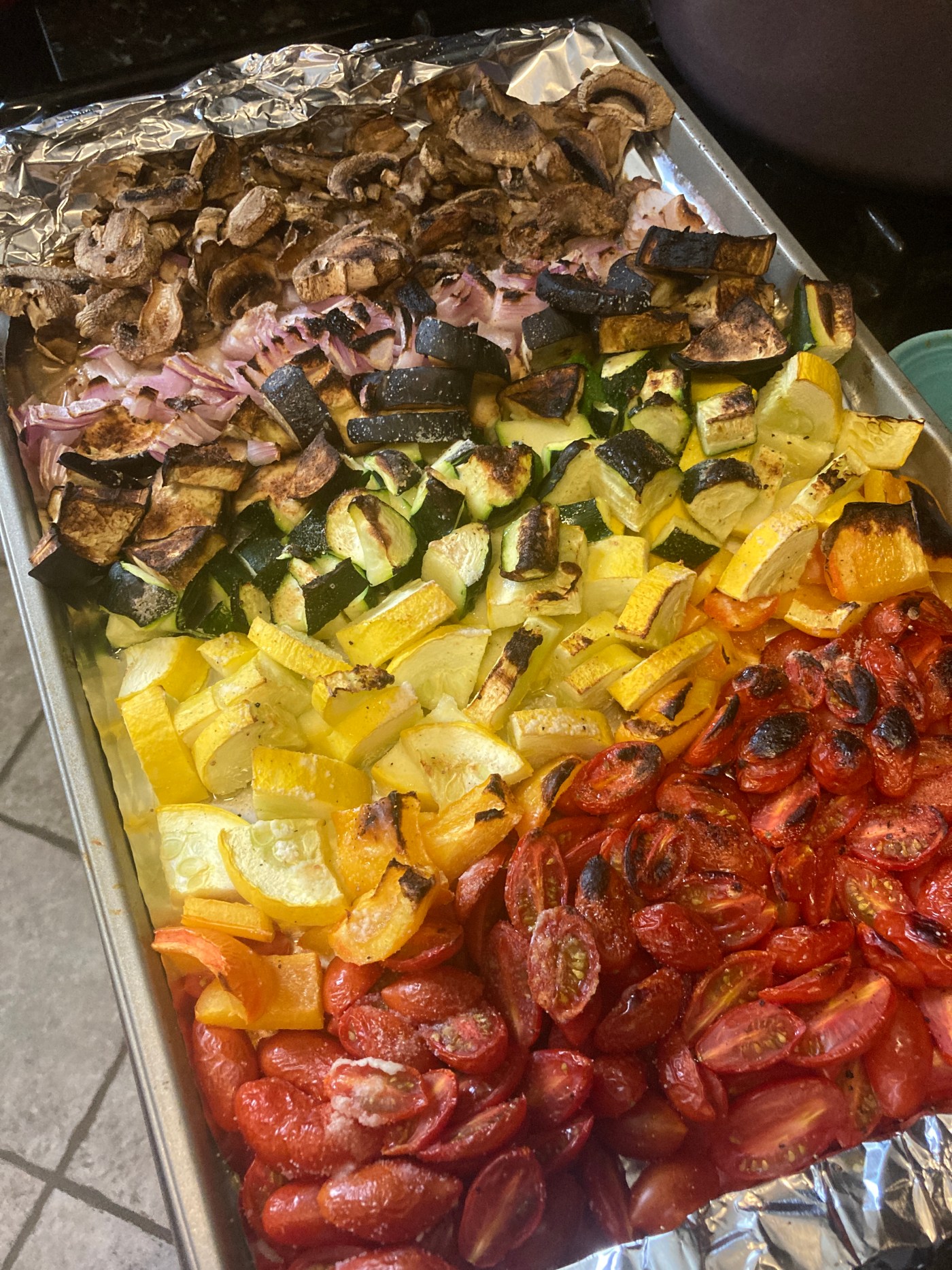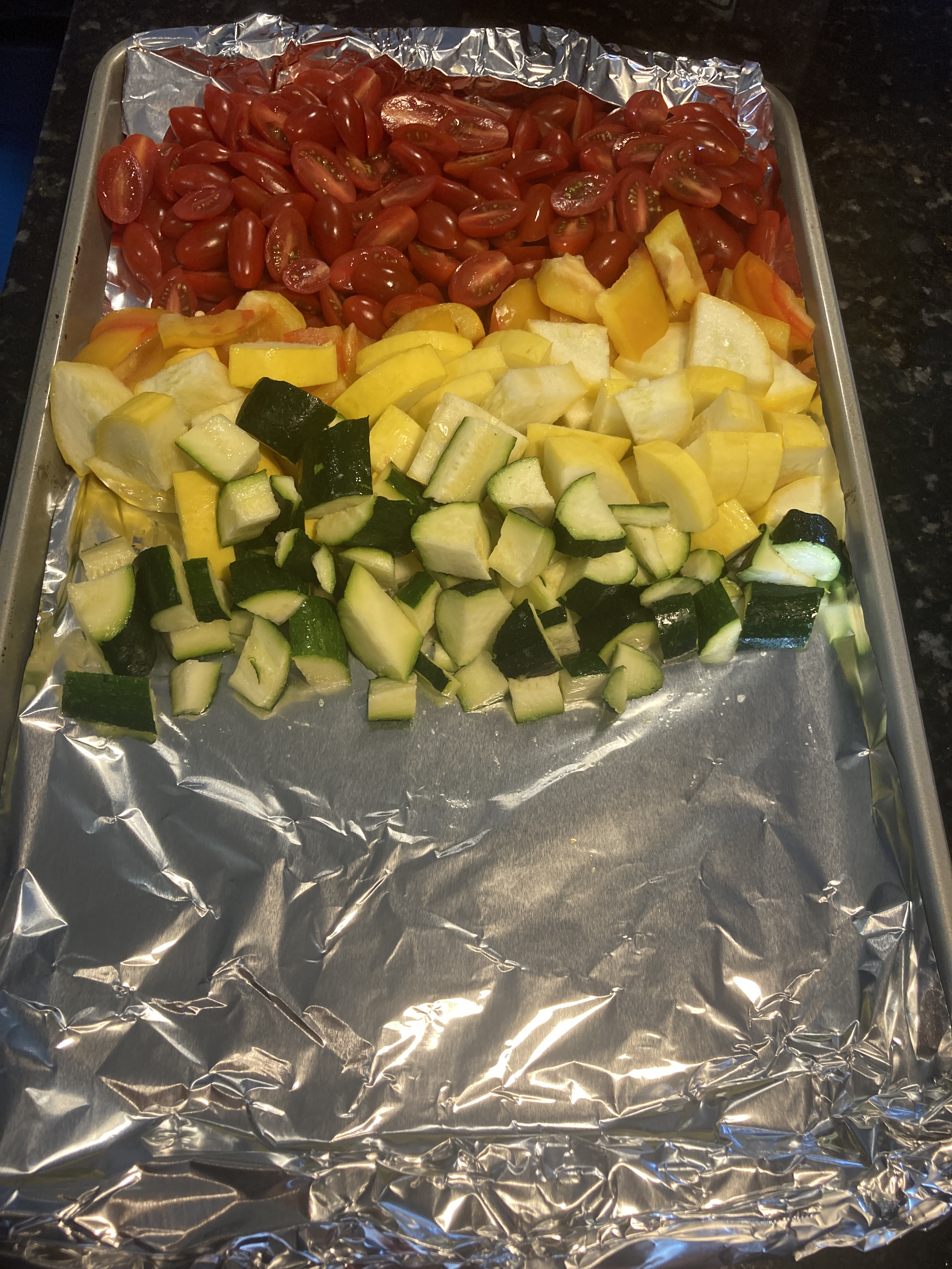 - Lay out the vegetables on the baking sheet: tomatoes, bell pepper, squash, zucchini, eggplant, onion, and mushrooms.