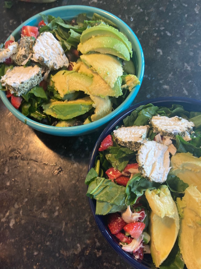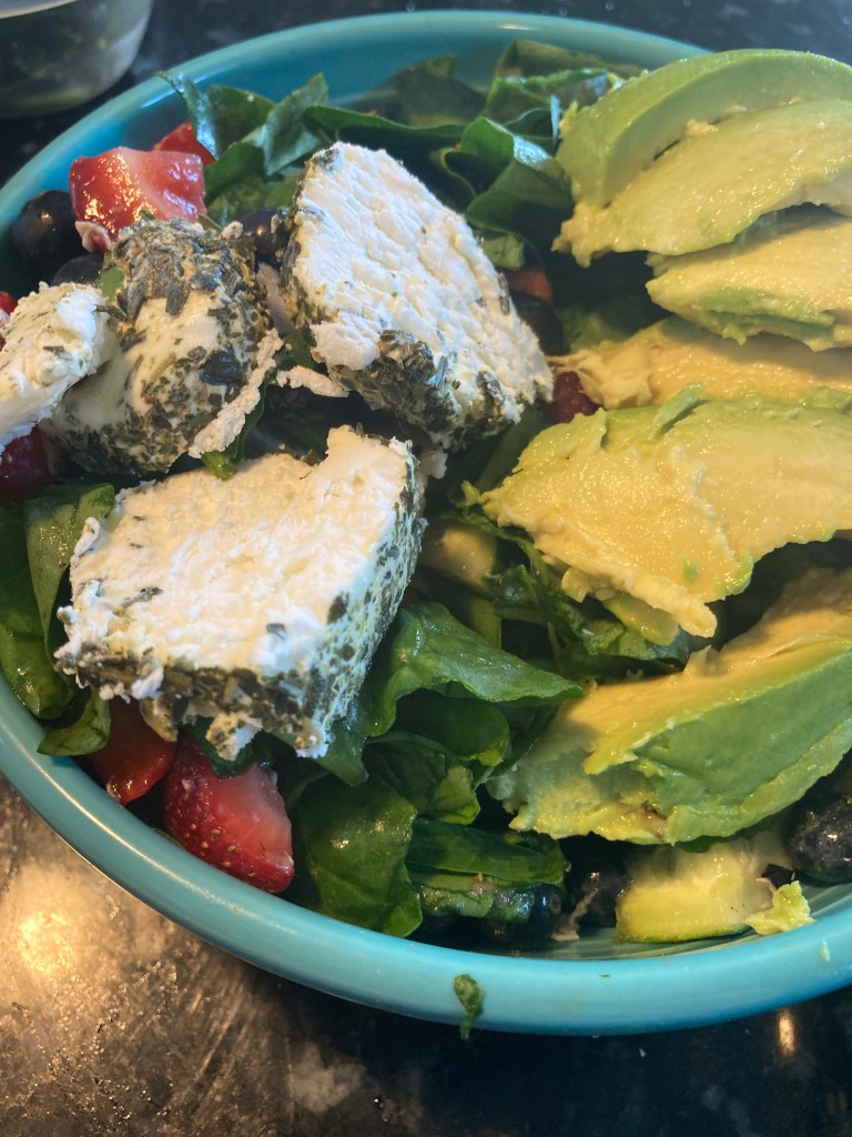 - To serve top with half a sliced avocado, 1 ounce of goat cheese, and Raspberry Vinaigrette. Enjoy!