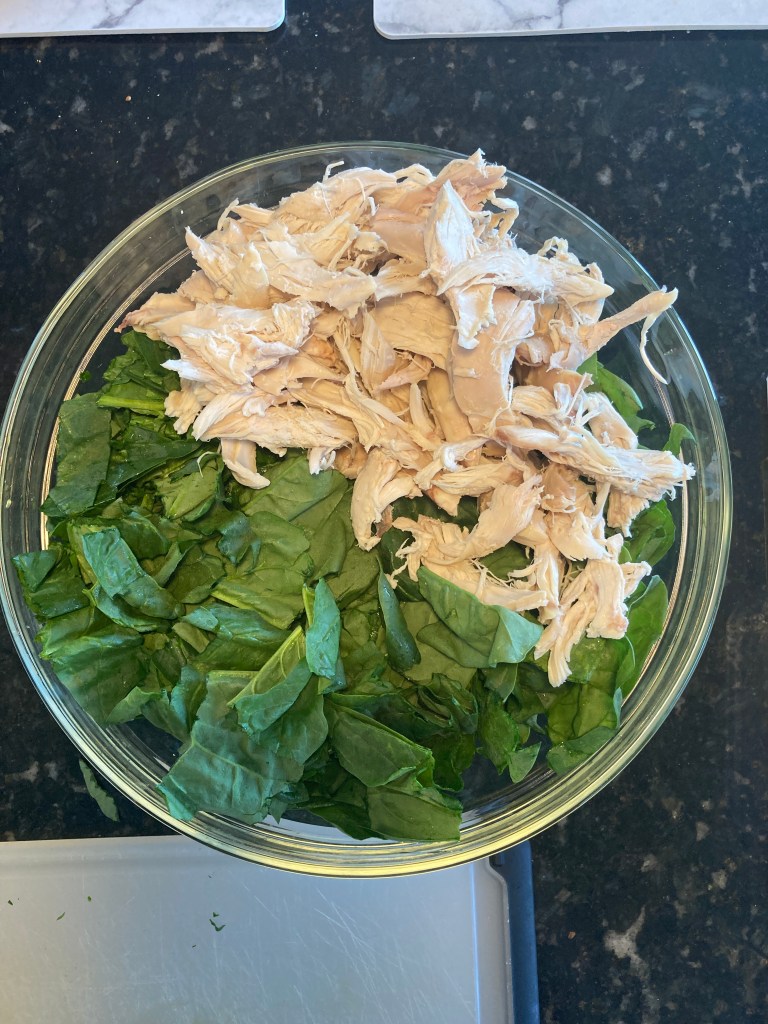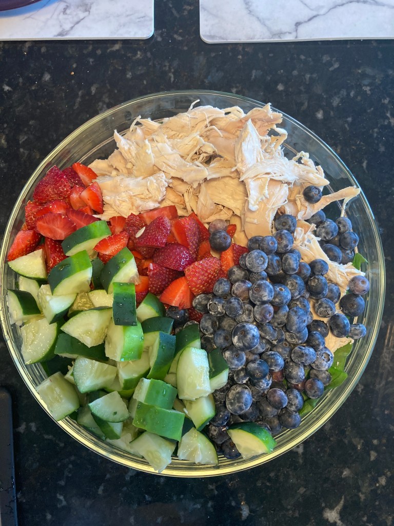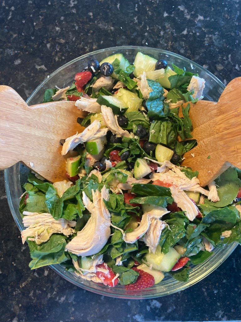 - Chop the spinach, strawberries, and cucumbers. Toss the chopped spinach into a large bowl, followed by the chicken, strawberries, blueberries, and cucumber. Mix thoroughly.
