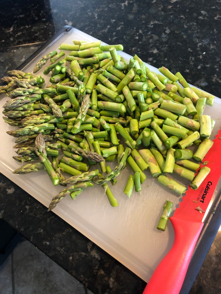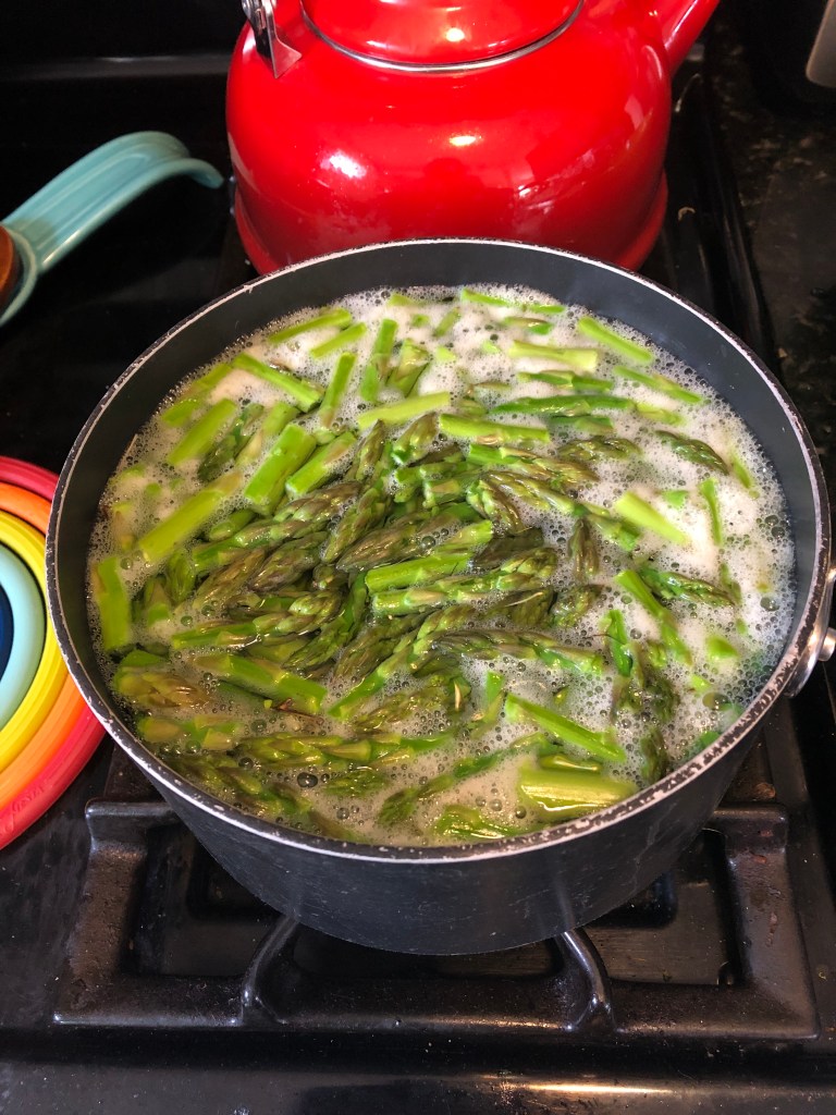 - Bring a large pot of salted (very salted!) water to boil. Remove the ends of the asparagus and chop into pieces roughly one inch long. Add to the boiling water and cook for about 4 minutes. Remove with a slotted spoon and add to a large bowl.