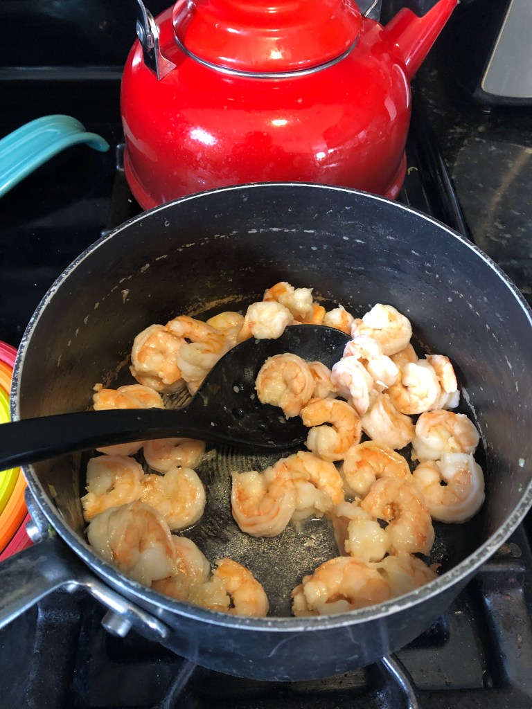 - Empty the pot. Add about a tablespoon of olive oil. Add the peeled and deveined shrimp and cook until fully pink – about 2 to 3 minutes on each side.