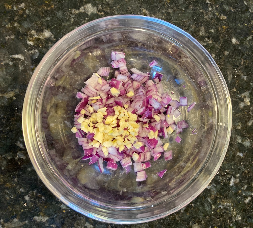 - Dice onion and garlic and mix with ginger.
