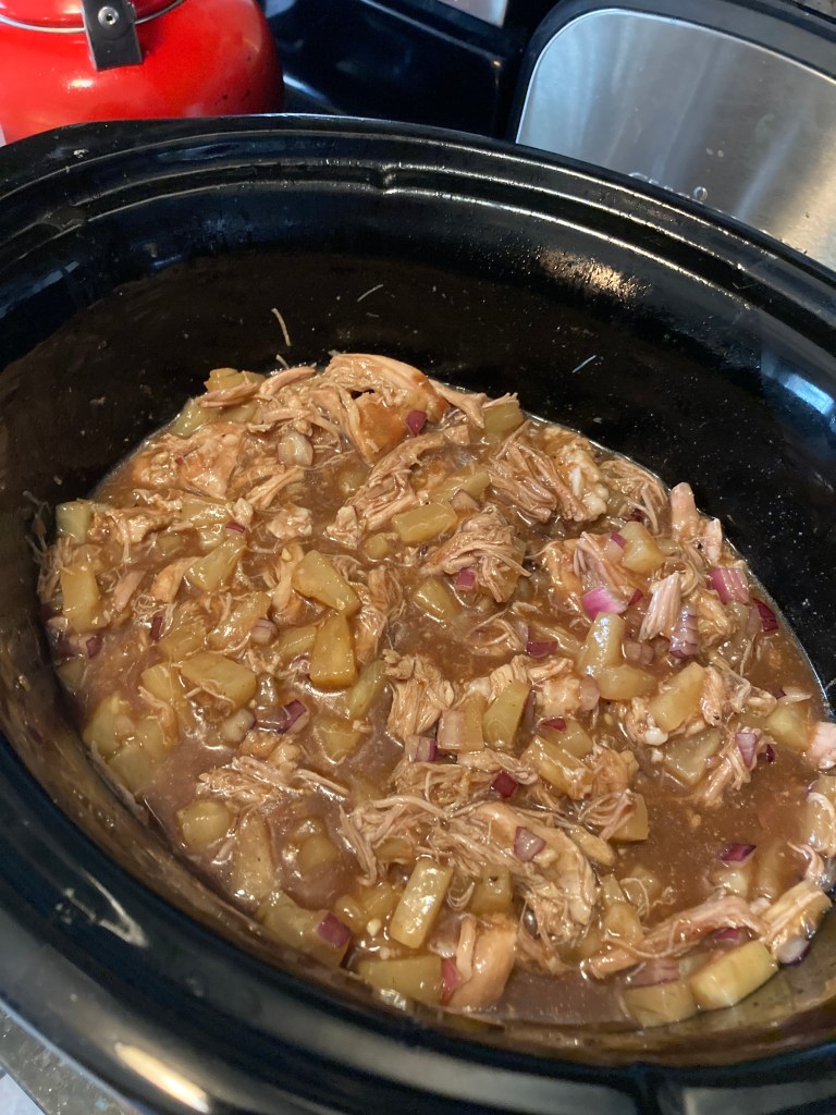 - After the pork has cooked for eight hours, remove the meat from the slow cooker and set aside. Drain out the excess liquid from the slow cooker. Shred the pork (removing any excess fat) and return to the slow cooker. Add the pineapple-barbecue sauce. Mix thoroughly and cook on low for one hour.