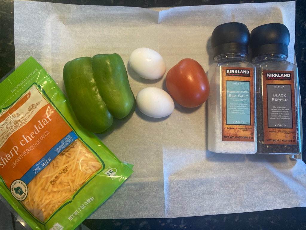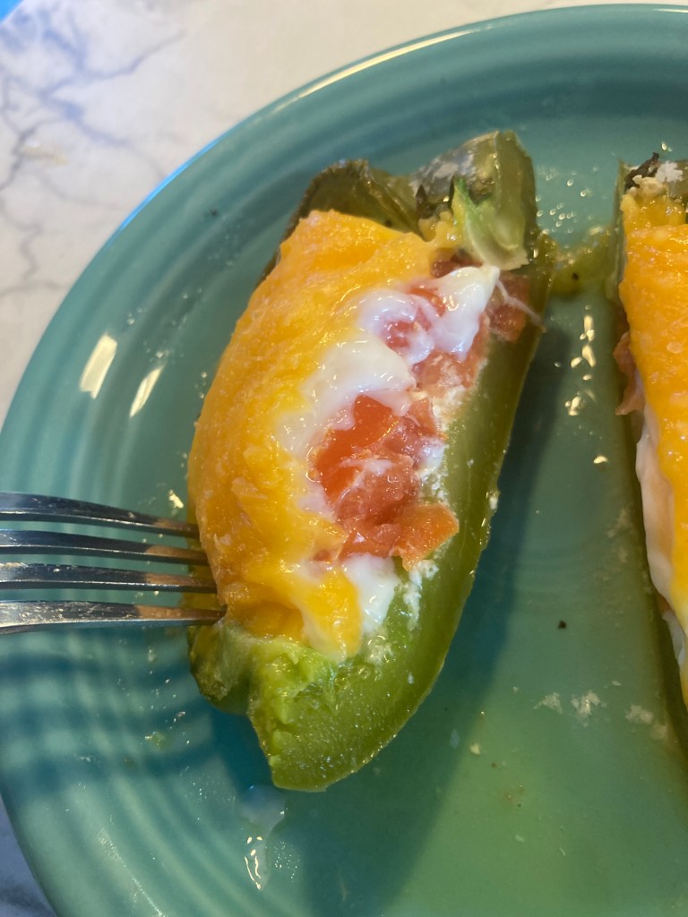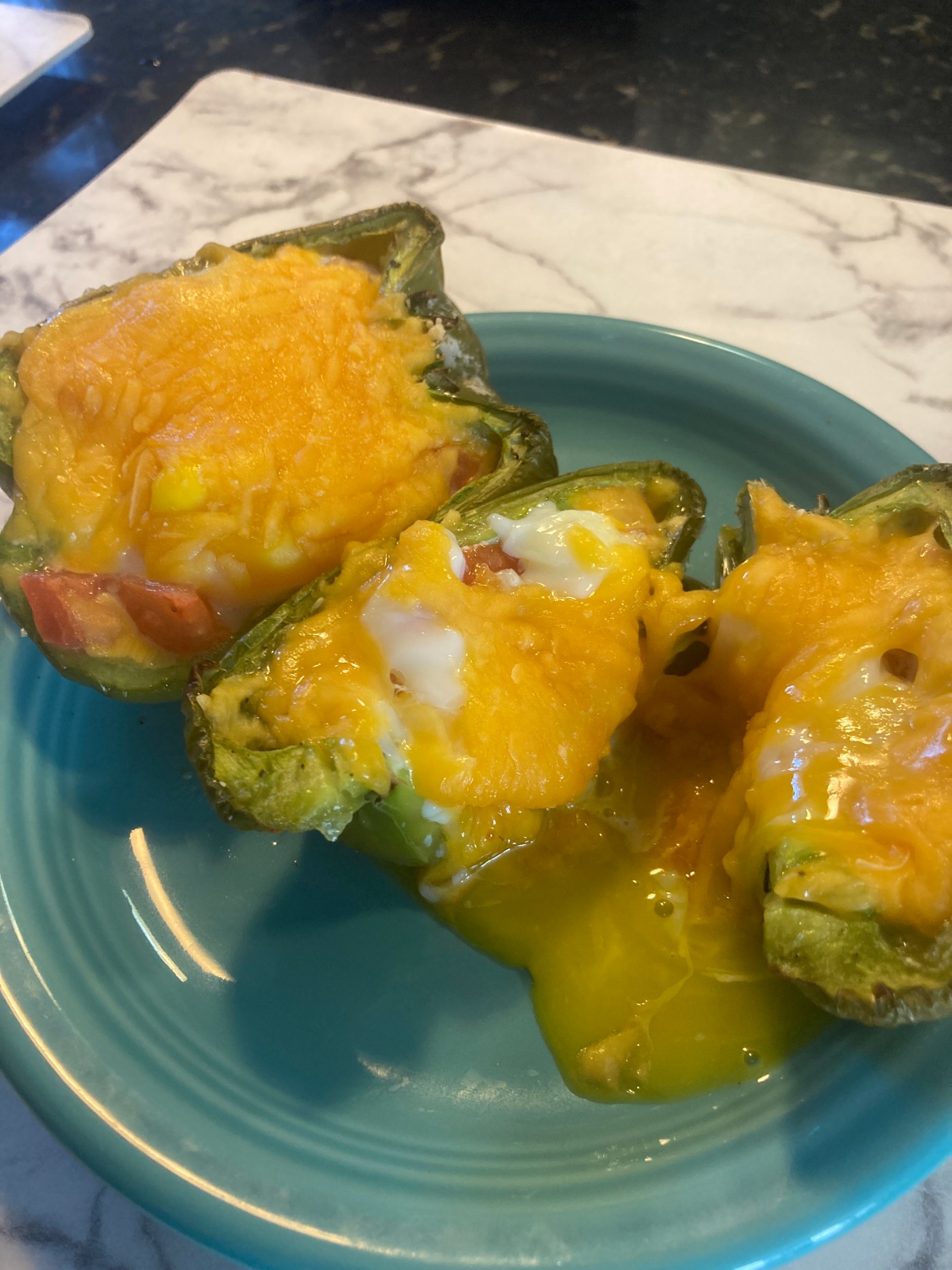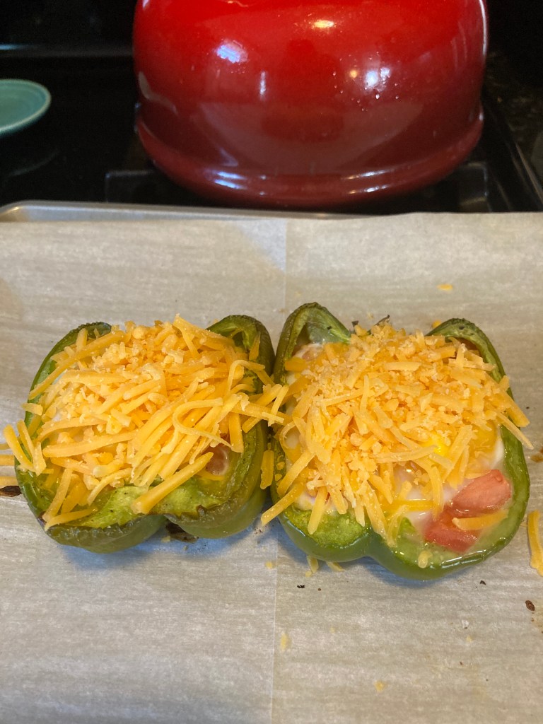 - Remove the peppers from the oven and add in the chopped tomato. Crack the egg over the tomato. Season with salt and pepper. Bake for 17 minutes.