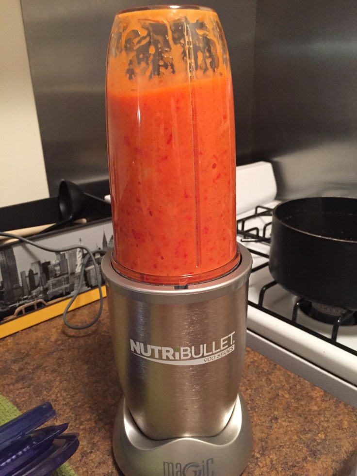 - Once cooled, pulse your roasted vegetables through a food processor or blend in a pot with an immersion blender. Continue to do so until desired consistency is reached.