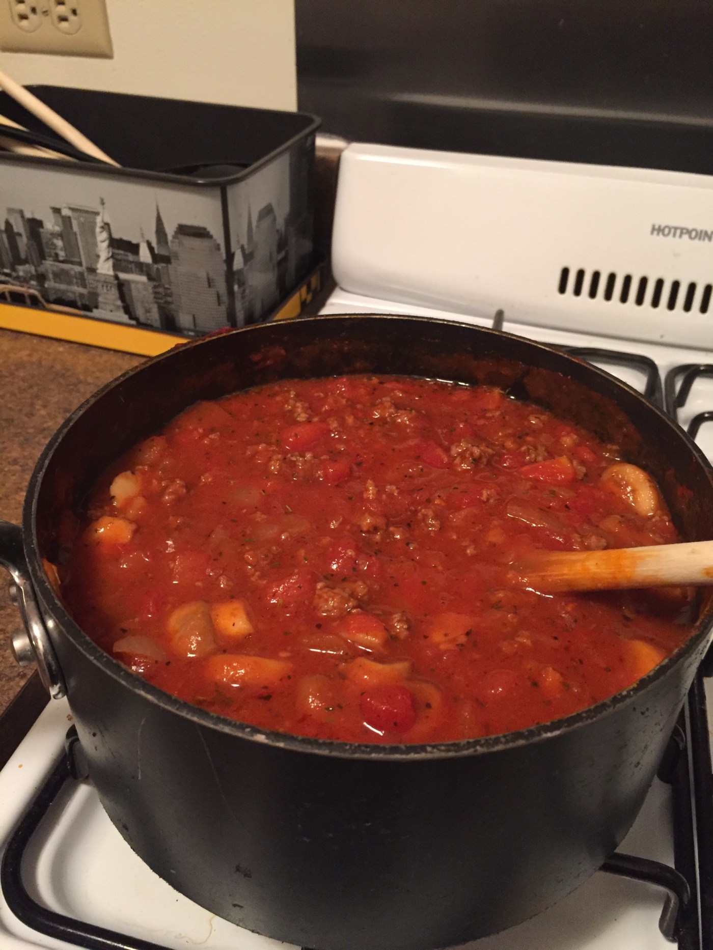 - Add diced tomatoes, sauce, and paste and bring to a boil.