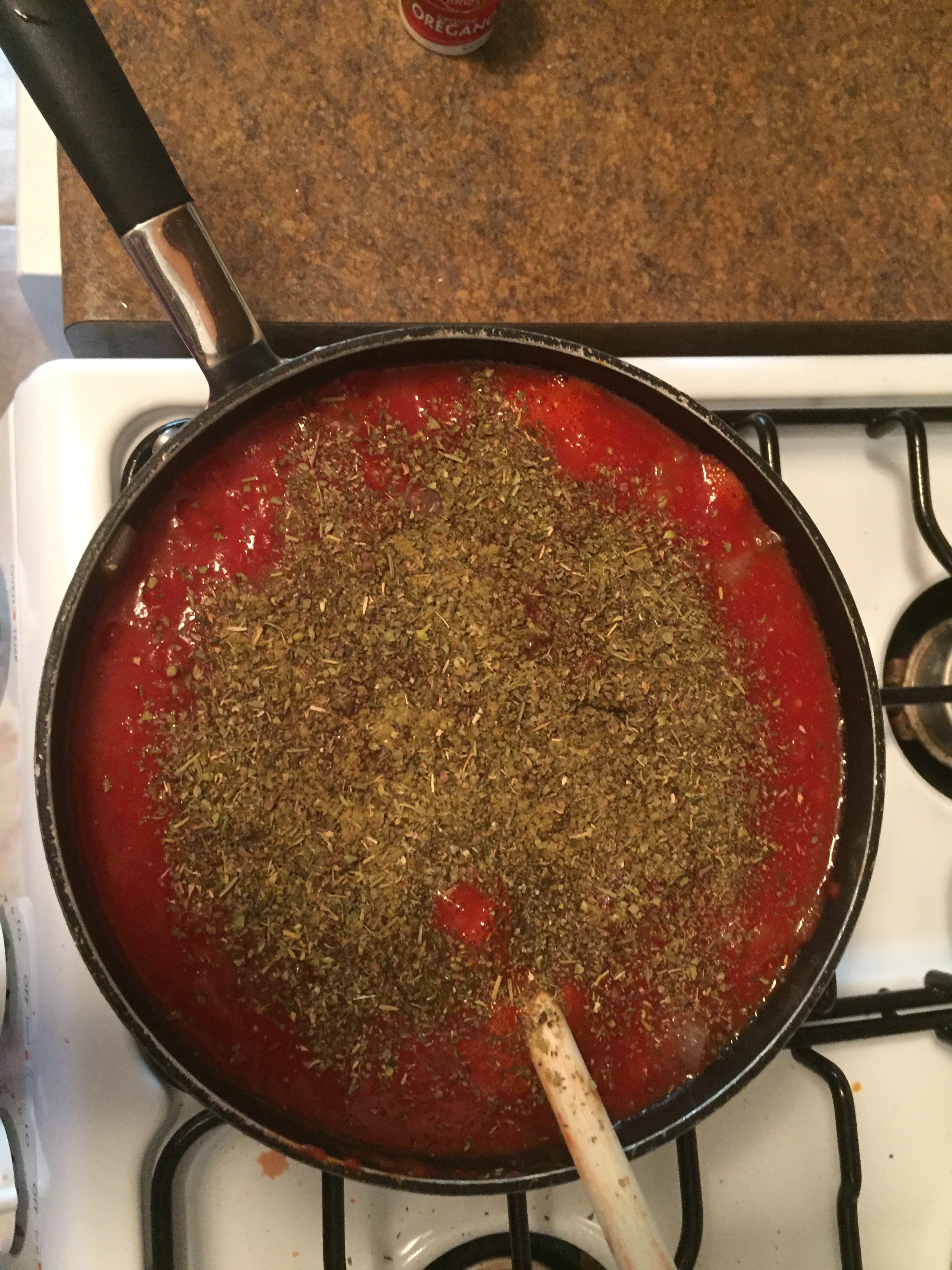- Add diced tomatoes, tomato paste, and tomato sauce. Stir thoroughly. Add, basil, Italian seasoning, and oregano. Stir thoroughly and bring to a boil.