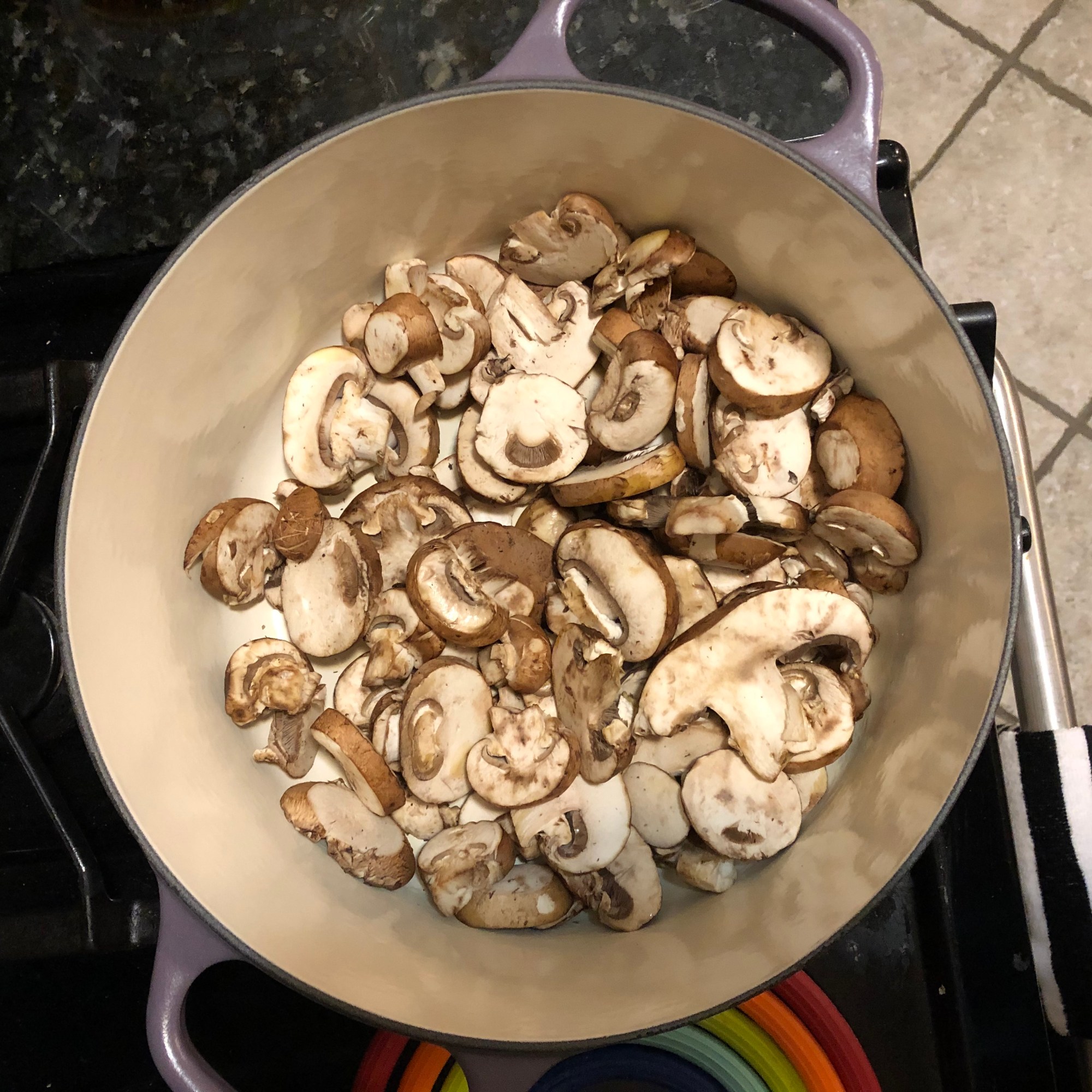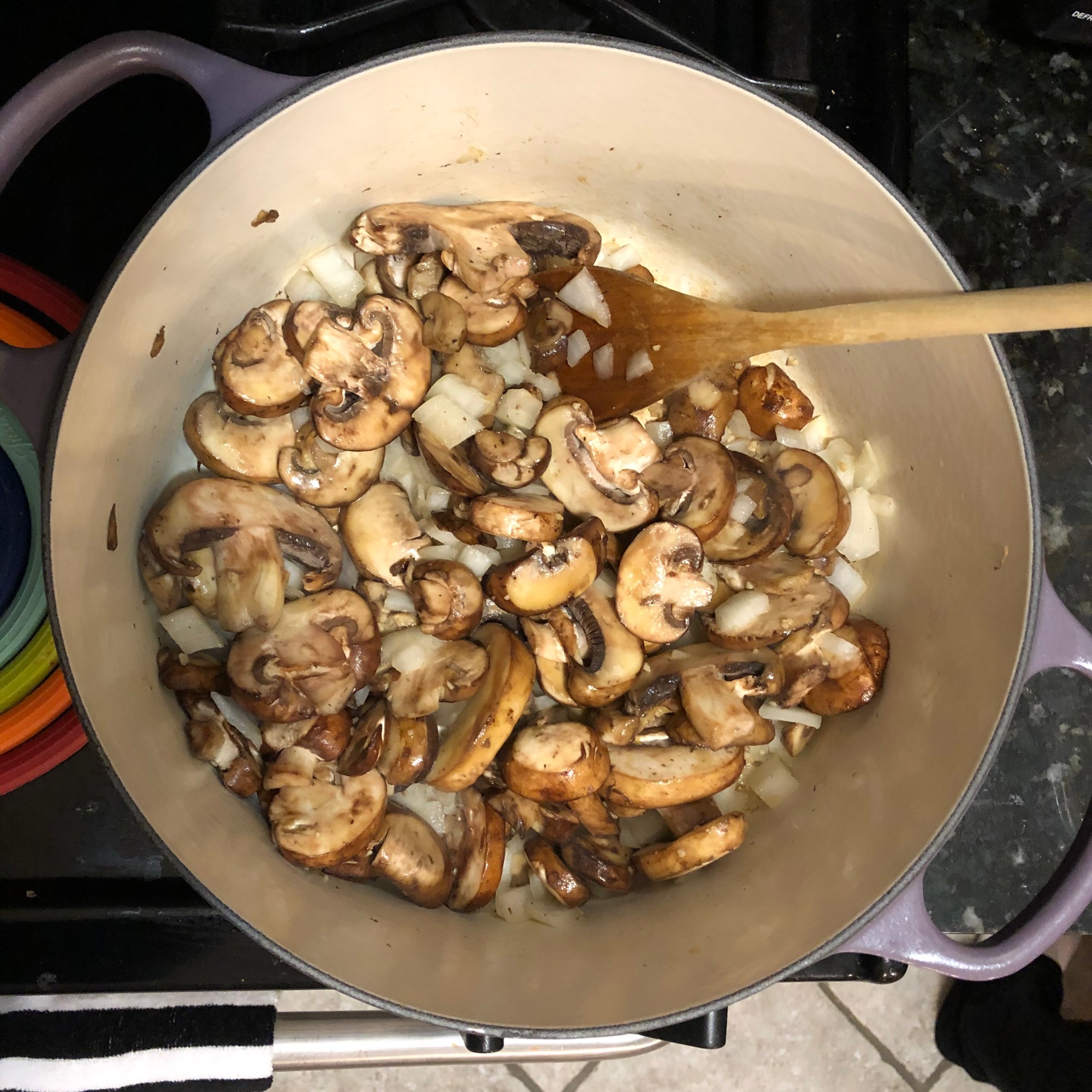 - Heat olive oil on medium high in a large pot or dutch oven. Add sliced mushrooms and cook until slightly browned, about 5 minutes. Add onion and garlic and cook until translucent, another 5 minutes.