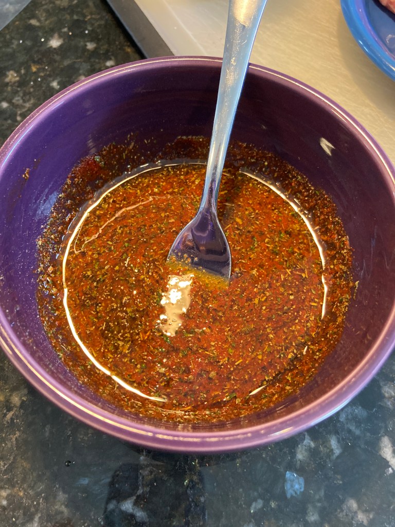- In a small bowl, mix together olive oil, lemon juice, and spices. Place chicken thighs in a large Ziploc bag and pour in marinade. Mix in with chicken and marinate in fridge for at least 1 hour (ideally 3 hours!).